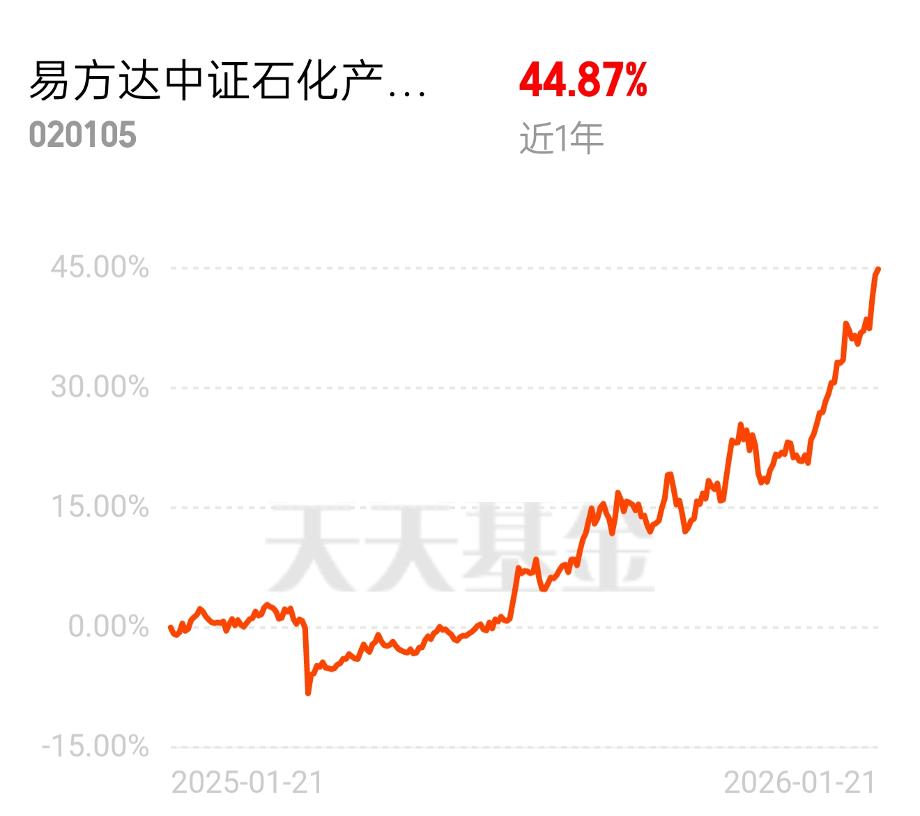 地缘局势推高油价,国内原油期货震荡反弹,石油天然气领涨超吸睛,易方达中证石化产业 ETF 联接发起式 C 近 1 年 44.87%,三桶油 + 细分化工机会都想抓住,买石化产业跟上节奏$易方达中证石化产业ETF联接发起式C$