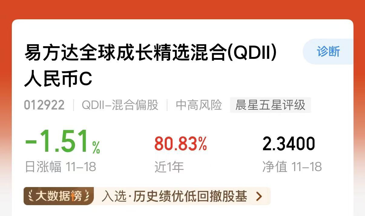 市场不算太稳但有主线,科技股长期潜力依旧,英伟达三季报表现亮眼,拉动美股期货上涨很给力。我一直拿着易方达全球成长混合C,覆盖A股、美股、港股科技标的,分散配置更稳妥,近一年涨幅80.83%,