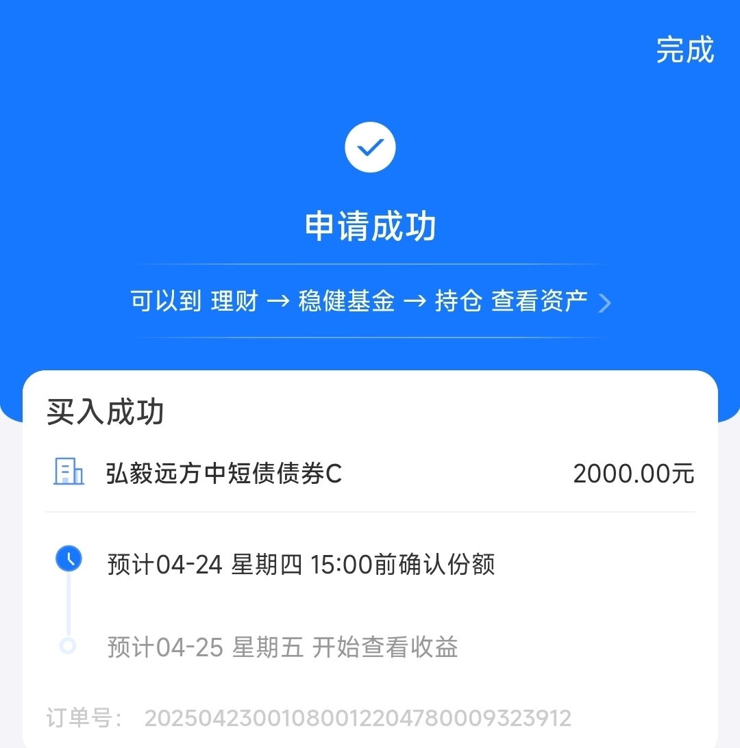 近期权益市场波动加剧,“股债晓跷板“效应显现,弘毅远方中短展现了较强的抗跌能力,今日未丢蛋,这与基金经理伍银良好的择时能力密切相关。该基金主要配置中短久期债券,包括国债、政金债等高评级品种,且不投资股票或可转债,信用债持仓均要求AAA评级,防御性强!今日继续加仓2000元