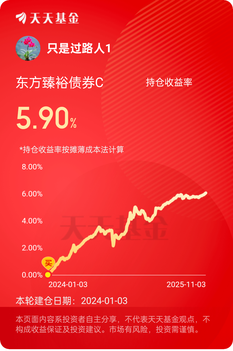 今天债市有点分化,利率债回调了,信用债倒是还算稳定,大盘也限着震荡调整。这种行情下,我还是继续配置固收+更踏实,趁着调整继续布局起来$东方臻裕债券C$ #晒收益#