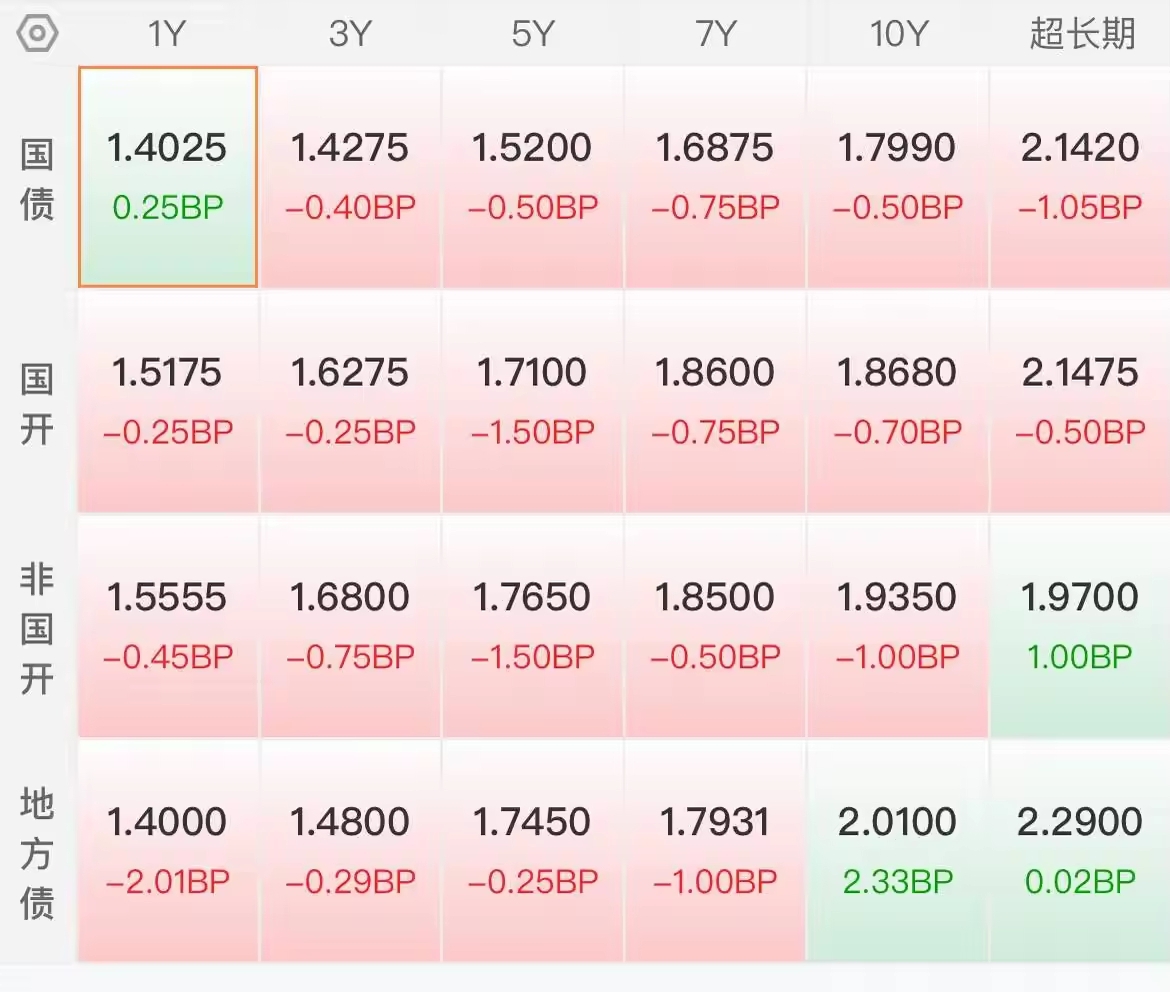 拉升拉升,债市的行情越来越稳了,今天延续小晴天儿,收的机会来了,利率债交易活跃度拉满,成交量还是蛮多的,不管是短期利率还是长期利率,整体表现还是很不错的,信用债表现也很亮眼,大多数都是红色的。