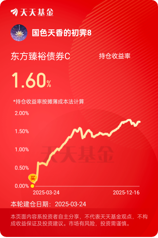 债市天气情况,利率债拉升晴天。信用债小晴天,城投债晴天,银行债小晴天今日只加稳健性基金,又是躺平稳稳收蛋的一天,希望下午盘能继续往上拉升一下哈!$东方臻裕债券C$ #晒收益#