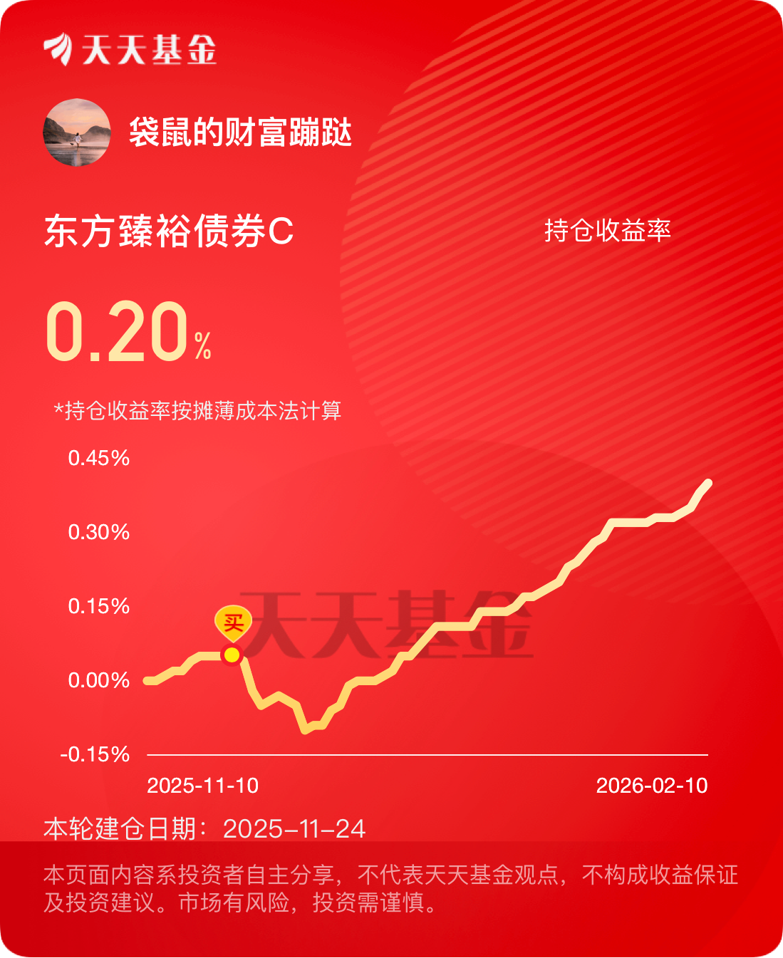 债基今天稳中有涨,波动极小,行情比较踏实。现在市场起伏不定,更显债基可贵,不愧是组合里的压舱石。耐心持有,每天来点小收益。