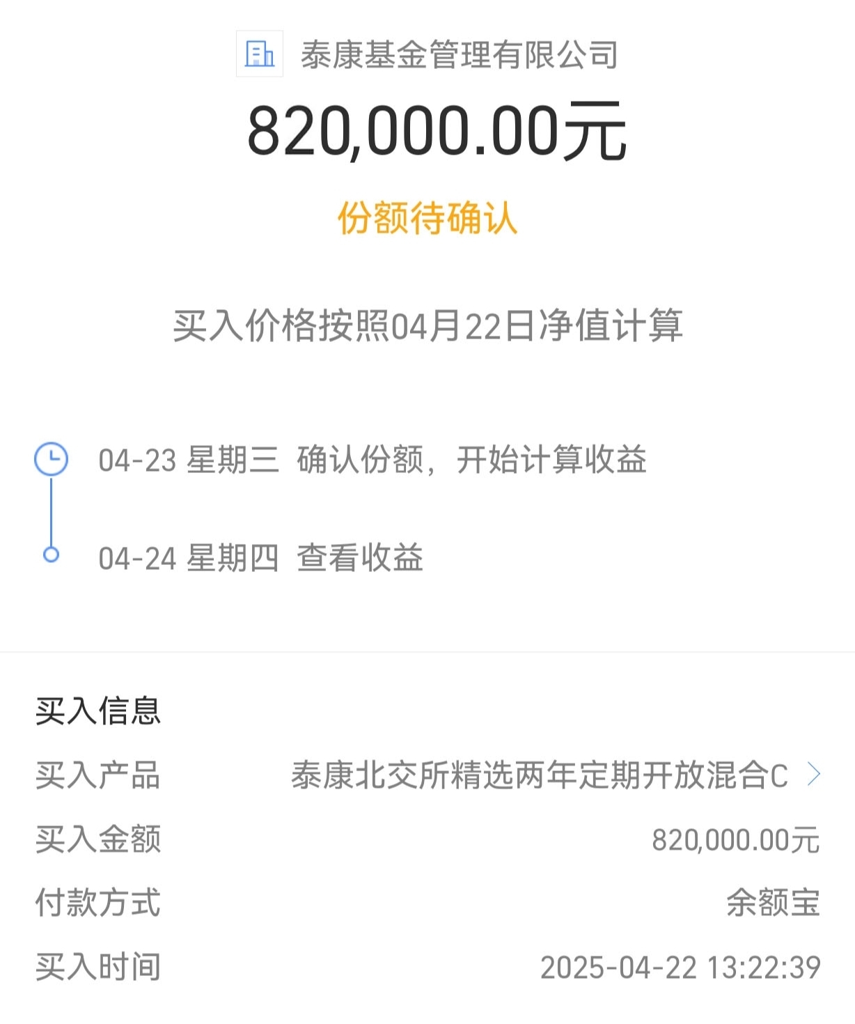 今天不等了直接打满82w$泰康北交所精选两年定开混合发起C$ !其实北交所作为专精特新“小巨人”企业聚集地,现在政策催化+专精特新主线明确,十四五规划支持创新行业,税收优惠、研发补贴,深度度绑定高端制造与国产替代机遇,这支的话就是布局北交所,重仓高端装备、新材料等北交所核心资产,通过精选高成长个股,兼顾进攻性与抗波动性,最近三个月也是大涨27.14%,近一年更是涨69.25%,业绩亮眼,而且两年封闭运作减少短期申赎扰动,利于长期把握北交所企业成长红利,所以今天撒谎概念车,短期市场情绪回暖与估值修复共振,逢低布局,把握专精特新主线崛起与政策红利的双重机遇,中长期分享北交所高质量发展红利,期待吃肉了!