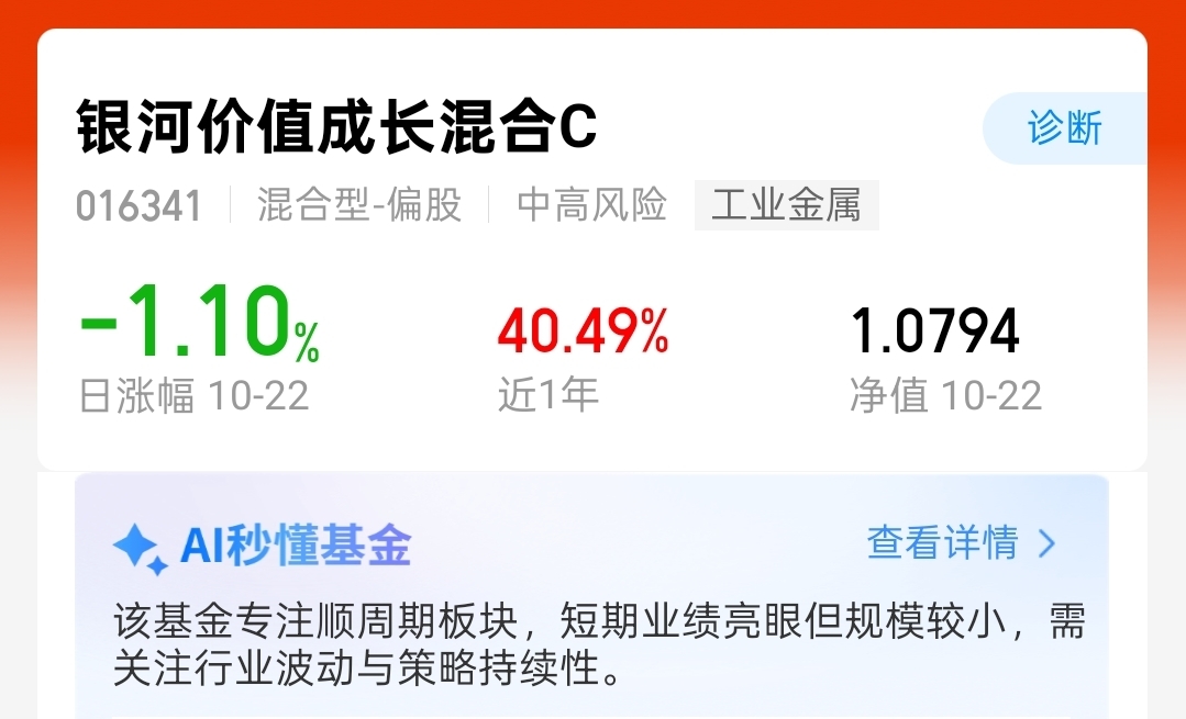 市场普遍预期,10月-12月美联储降息可能性较高,高盛和摩根持续展现出对中国市场的乐观态度,A股比美股还有不少上涨空间,值得配置。上车银河价值成长混合C基金,持仓聚焦金属、矿业等板块的优质成长股,如资源行业龙头紫金矿业、洛阳钼业,以及细分领域佼佼者华鲁恒升、振华股份等。这些标的业绩稳健,成长确定性高,长期增值潜力较好。