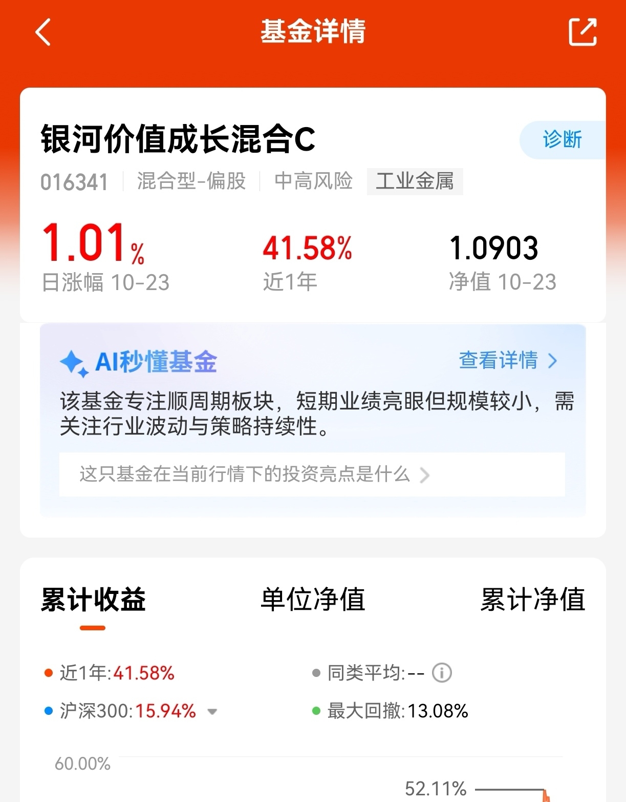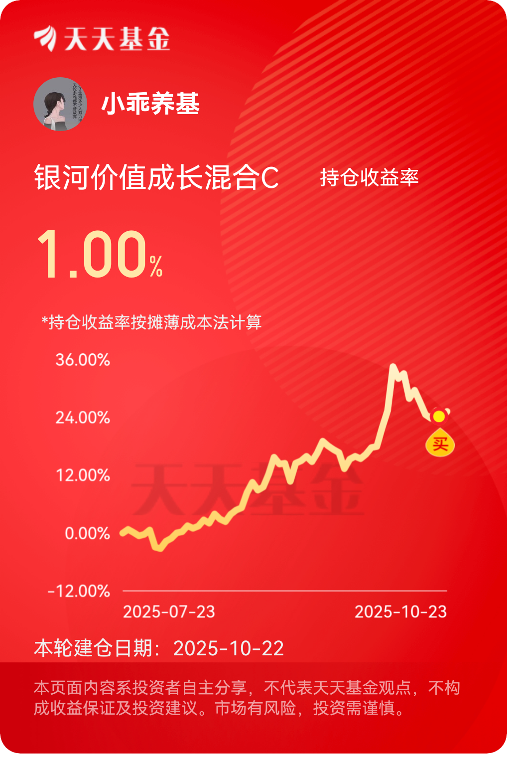 白天看市场来回震荡,尾盘居然拉回去了,刚看$银河价值成长混合C$ 这只基有意外惊喜,今天涨了1.01%,近一年上涨41.58%,资金抢筹很明显,那后面还是有希望的。而且2025年有政策力挺,有色金属和基础化工大概率会有好表现,每次回调不要犹豫,加仓就对了。