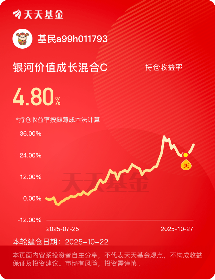 买的早不如买的巧,最近收益还不错呀,近一周快5个点,聚焦高景气周期赛道,专挑龙头企业重仓,筹码集中涨得猛,继续躺着$银河价值成长混合C$ #晒收益#