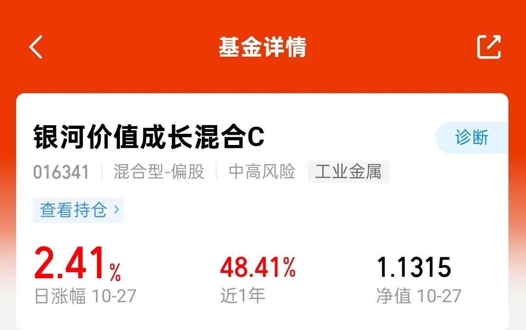 果断上车了,银河价值成长混合C,持仓结构丰富且优质,黄金、工业金属、能源金属、农化、油气制品,第三季度业绩有支撑和明确的成长确定性,连续3天上涨,近3个交易日分别涨了2.41%、1.34%、1.01%。近6个月更是飙升49.45%,长期稳定跑赢沪深300指数(19.2%),上涨概率大且风险相对较小,挺好契合我追求稳健上涨的需求,即便有回调涨起来也比较快,继续上车。