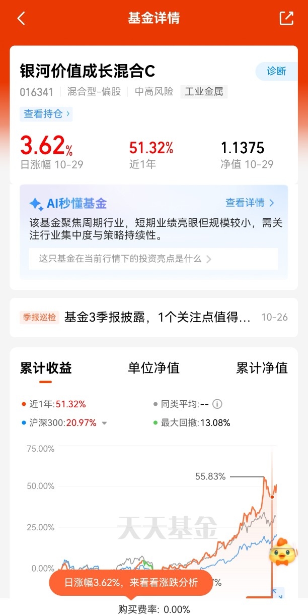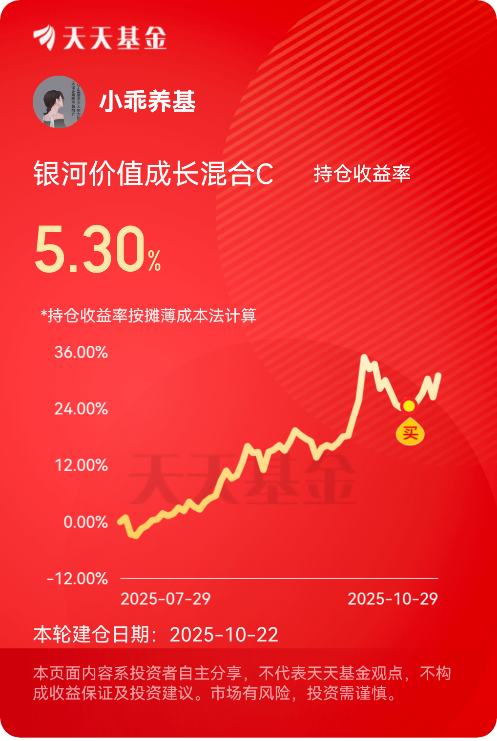 开心,大盘又反弹了,$银河价值成长混合C$ 今天收涨3.62%,短期修复得快、长期涨得稳,近1年涨超51.32%、持仓主要是有色化工龙头企业,靠谱又省心,开心,又小赚一笔,晚上夜宵有着落了。