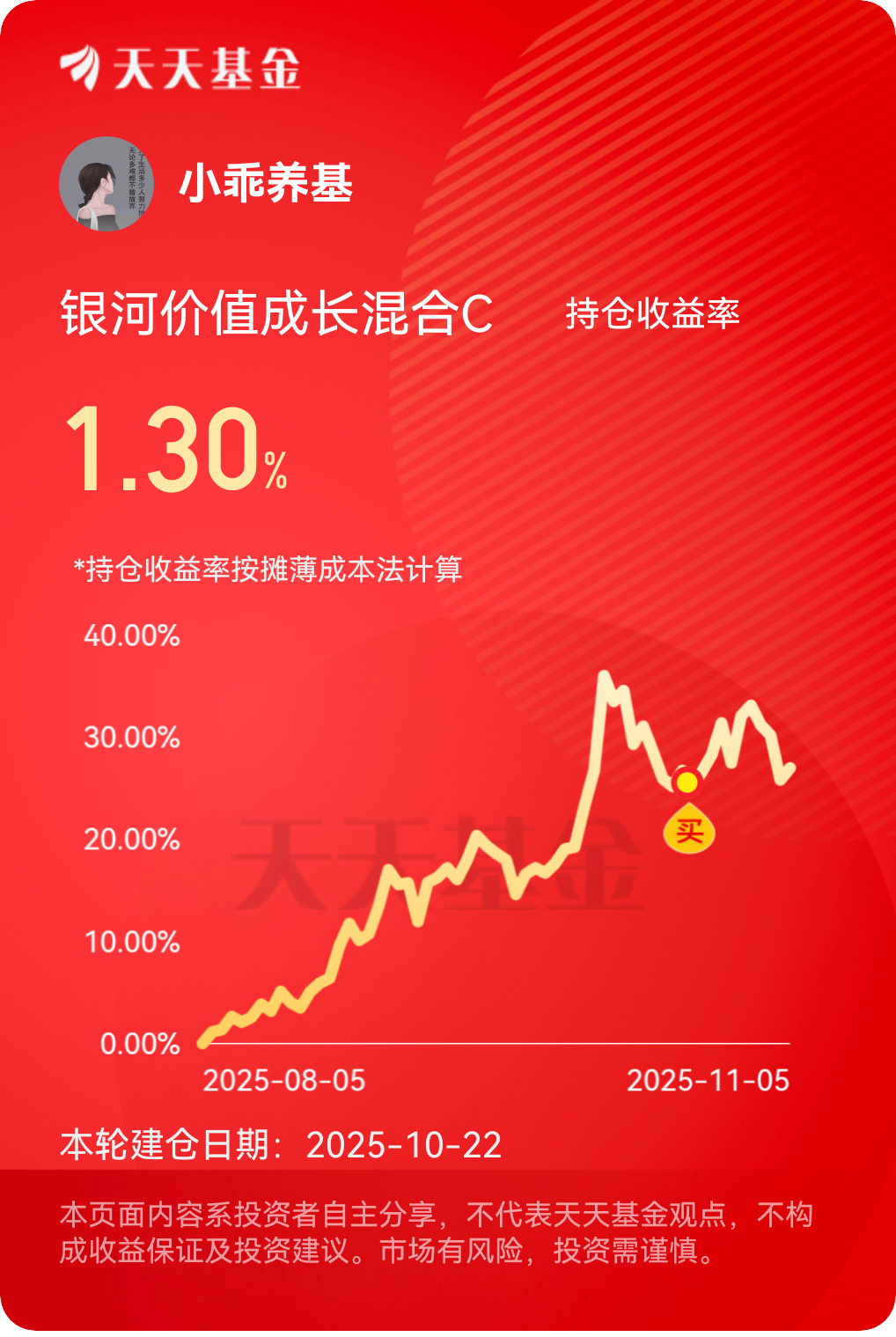 市场低开高走,今天不错,开始修复了,刚看$银河价值成长混合C$ 这只基今天红了0.93%,近一年达42.73%,业绩属实亮眼呀,有色金属和化工板块随大盘震荡调整拉升走红,早盘龙头标的略有承压,但资金布局信号已现,继续拿住就是。