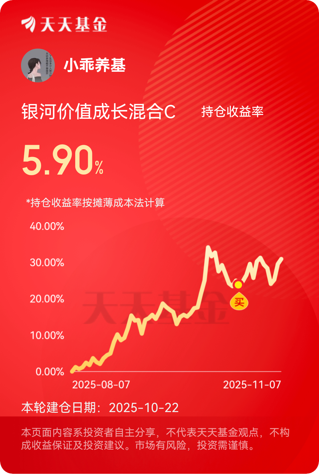 没想到吧,昨天大A那么强,今天还是震荡回调了,不过好在当前大盘还维持在了4000点上方,没那么搞心态,现在大A处于4000点高位,短期震荡可能会是常态,所以可以做一些低位板块的防御配置。$银河价值成长混合C$ 这只基就不错,持仓主要是有色金属和基础化工,已经三连涨了,我的收益不知不觉也超5.9%了,挺好的,而且这个位置这只基相对科技来说估值也是比较低的,继续拿住了。#晒收益#