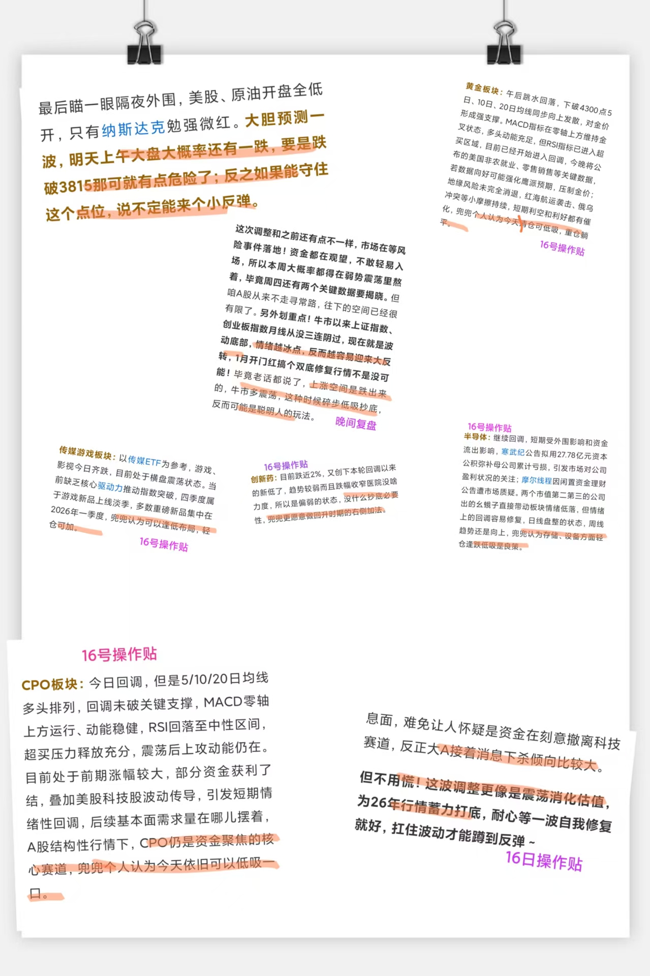 CPO板块:今天大涨,昨儿吸对了又是情绪修复主线板块,日线依托5日均线震荡上行,5日均线是短期强弱分水岭,回踩不破则多头趋势延续,板块内龙头股(光模块核心企业)技术形态强于板块指数,率先突破前高,带动板块情绪;周线5/10/20/30日均线呈多头排列,且各均线间距逐步拉开,说明上升趋势动能充足;MACD指标维持金叉状态,红柱虽有小幅缩窄但仍在零轴上方,属于上涨过程中的正常蓄力,未出现趋势反转信号,兜兜继续阶段性看涨!