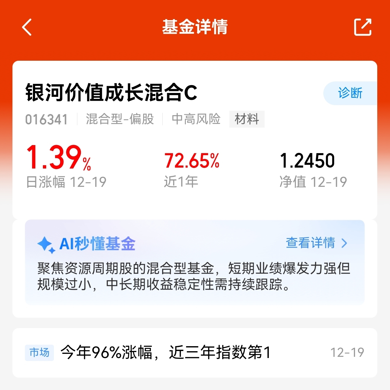 A股正处“估值底部+政策红利+长钱进场”三重机遇期,价值成长风格太香了!手里的$银河价值成长混合C$ 直接跟上节奏,最新净值1.245,近1月涨6.8%、近1年狂飙72.65%,爆发力拉满