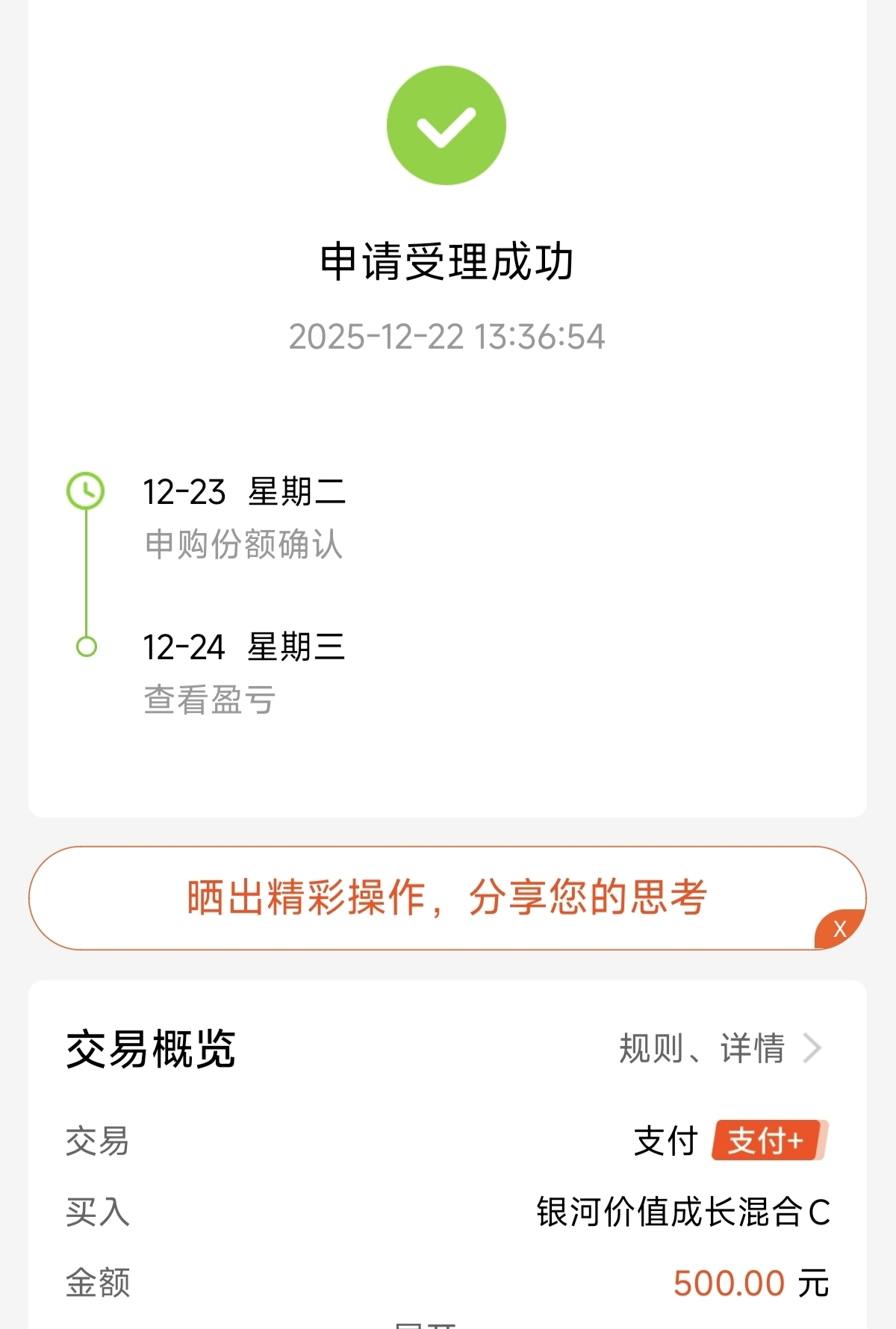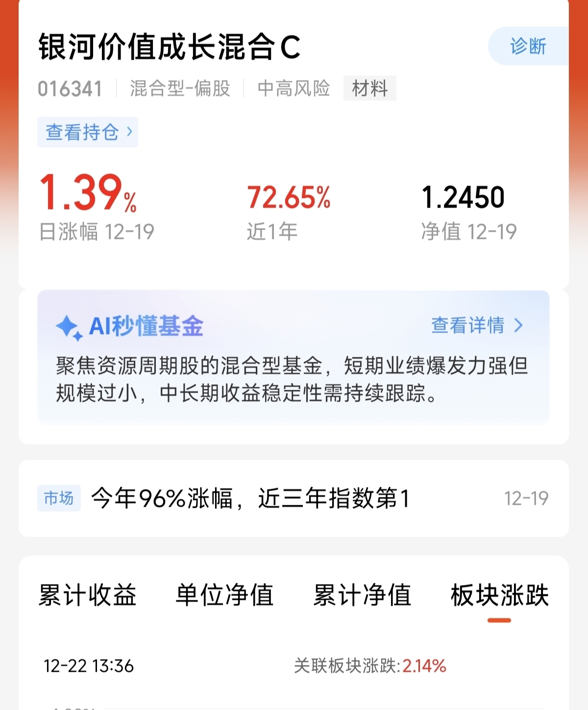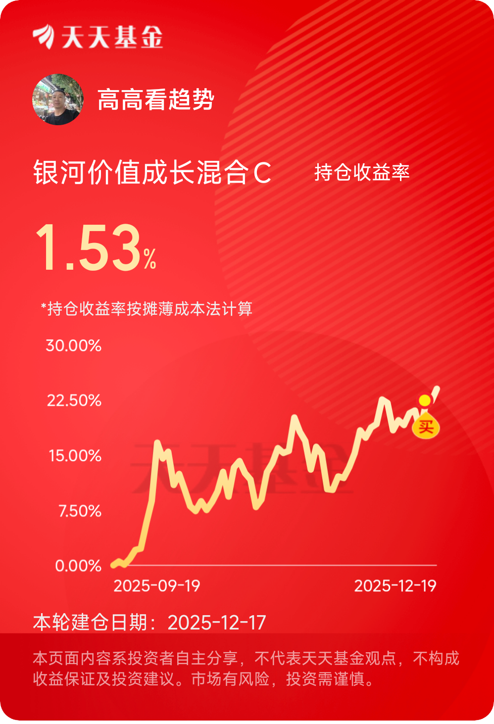 持有的$银河价值成长混合C$ 这只聚焦周期的主动混合基金,当前主要聚焦有色金属跟化工板块,在本轮行情中的表现一直不错。周五上涨了1.39%。近一周上涨了6.8%。同类业绩排名第四。近半年上涨了59.55%。近一年涨幅72.65%。而且由于均衡的持仓,遇到波动回撤控制也是比较稳定,长期稳定盈利的能力强。基金经理主动管理的能力优秀。我看好未来的成长表现,我今天继续补仓500。