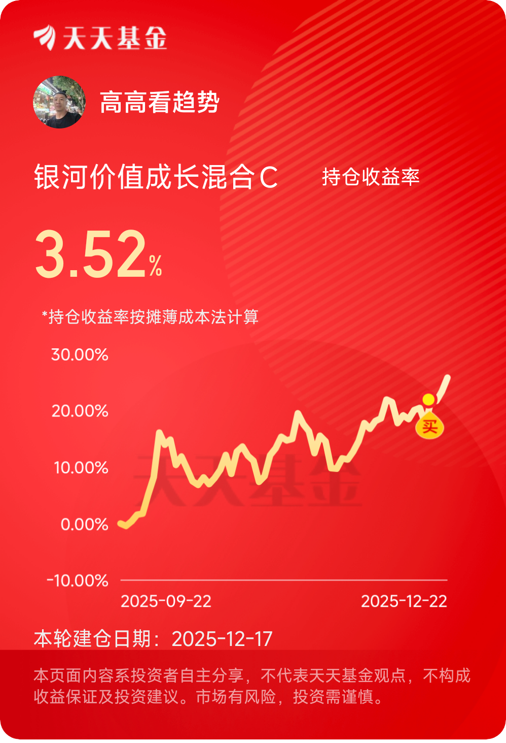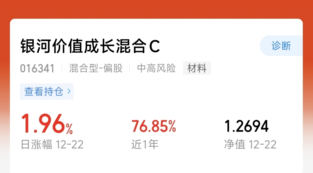 黄金上涨夜盘还在继续。$银河价值成长混合C$ 今天上涨了1.96%,聚焦有色金属跟化工,不但上涨能够跟的强,遇到波动回撤也是比较稳,近一年涨幅76.85%,我看好长期的稳定收益表现,我会继续补仓!