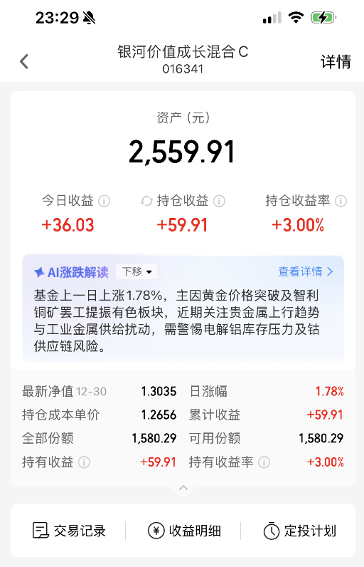 $银河价值成长混合C(OTCFUND|016341)$主动把握结构性机会:工业金属端布局铜、钼等龙头,受益于新能源车、AI算力与电网需求;黄金这边,避险、美联储降息、地缘因素,逻辑都还在,我近期也是持仓慢慢定投了,今日+1.78%,目前累计+3%,继续坚定持仓!