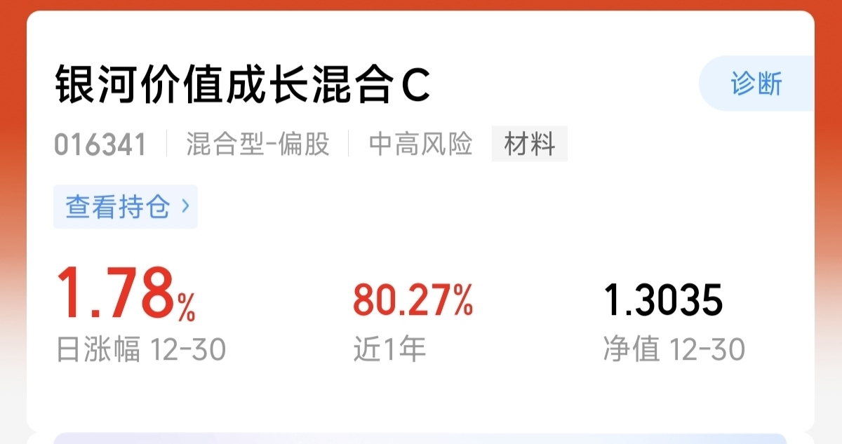 所以今天我继续布局持有的$银河价值成长混合C$ 这只聚焦有色资源的主动混合基金。目前主要投有色跟化工产业,持仓均衡,覆盖面更广,长期表现的稳定性一直不错。昨天上涨了1.78%,今天的估值又是接近两个点,近一年涨幅80.27%,目前有色整体估值还不高,我今天继续稳步定投500!