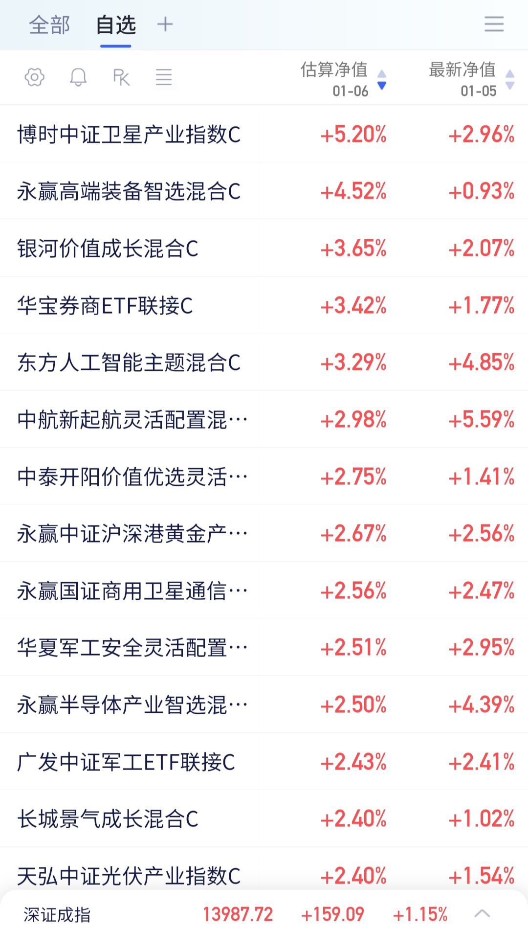 以下是部分自选基金当日收益估算(1:38分左右数据):