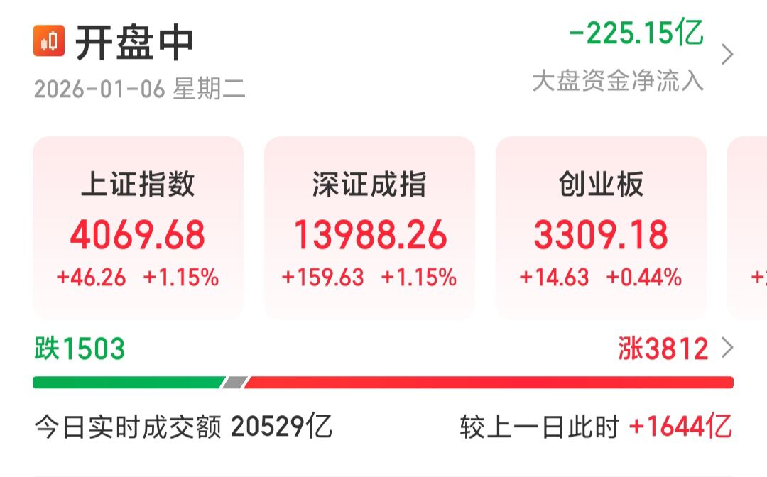 昨天A股全面上涨,收获2026年开门红,并且量能大幅增加5000亿,场外资金积极入场,在昨天我就感觉今天要继续上攻,果然今天A股延续上涨,尤其是上证指数涨幅再超1%,表现十分亮眼。技术上看,短线指标KDJ持续超买,按理来说需要修复,但是还是那句话,在牛市里很多指标可能会失灵,参考价值不大。当下主要还是看量能变化,今天继续放量上涨,上证指数K线13连阳,整体走势依旧良好,并且突破去年高点4034点,投资者信心进一步增加。