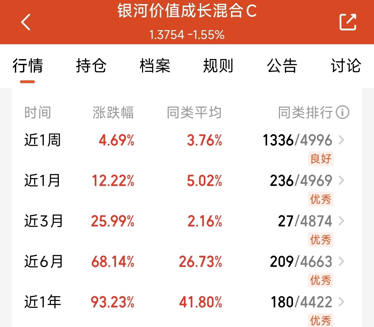 所以今天我决定继续布局持有的$银河价值成长混合C$ 这只主动的混合基金。目前主要聚焦有色金属跟周期化工,在本轮行情中的表现非常不错,持仓覆盖面也比较广,抗波动的能力好。近1月上涨了12.22%,近一年涨幅93.23%,今天的估值又是超两个点,马上又要翻倍了,我看好今年的成长表现,明天我继续定投500