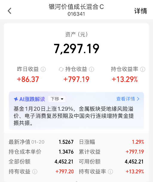 黄金继续创新高!有色金属也小幅反弹,我最近持仓定投加仓的$银河价值成长混合C(OTCFUND|016341)$,今日净值+1.29%,目前持仓累计+13.29%!