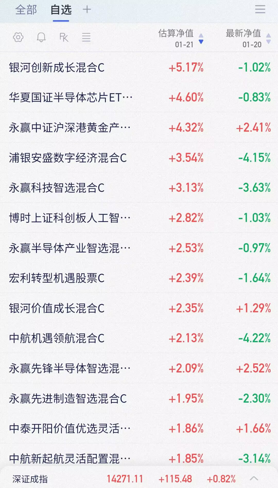 以下是部分自选基金当日收益估算(1:35分左右数据):