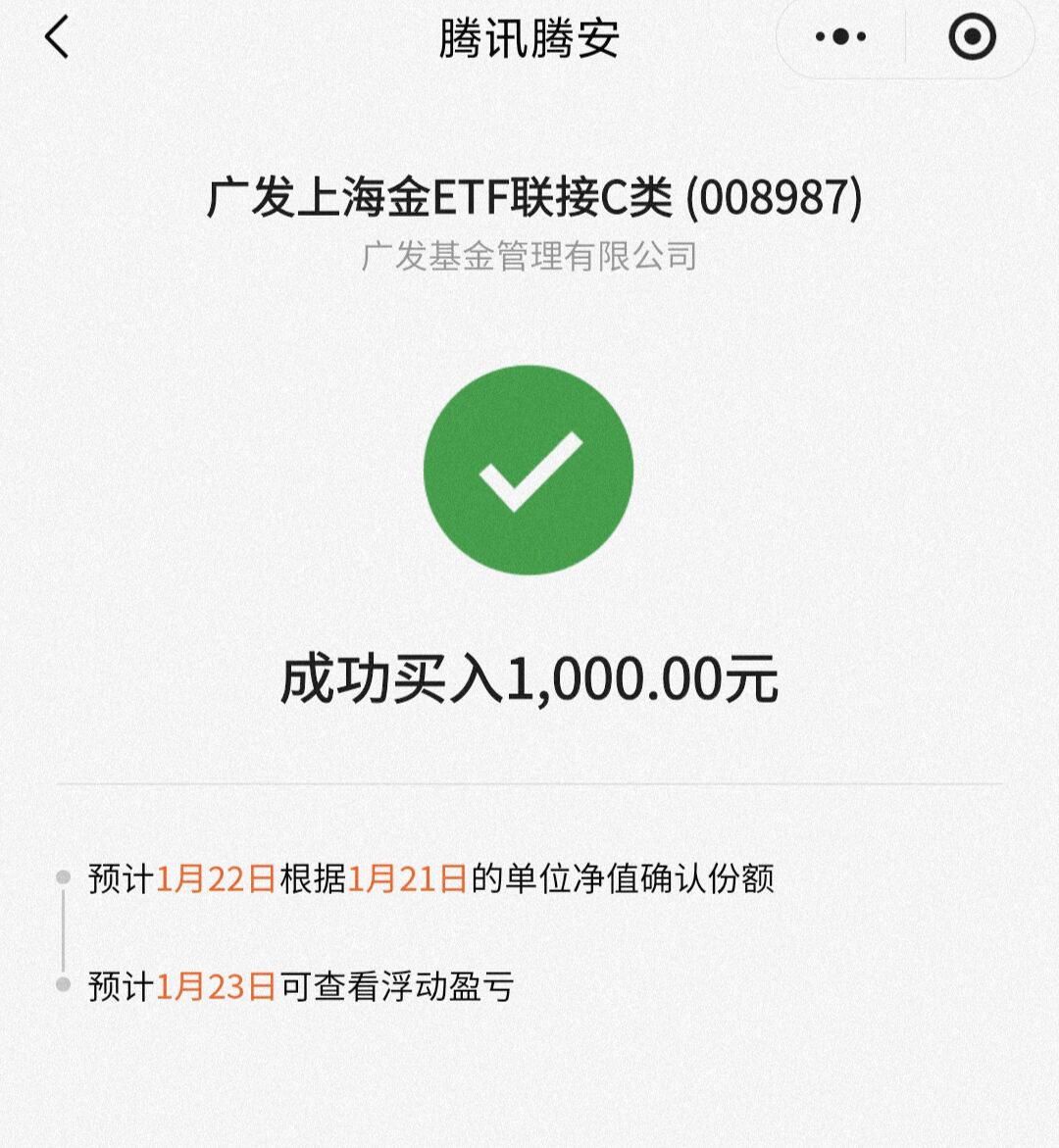 目前看影响黄金上涨的因素将会在很长一段时间内存在,多家国际机构看高黄金,花旗预计国际黄金有望在3个月内上涨至5000美元,我感觉是很有可能的,广发上海金紧密跟踪黄金价格走势,并且上海金定价机制透明,以人民币计价,该基金整体费率还比较低,我感觉是普通人参与黄金牛市的较好通道,因此今天决定加仓1000元。