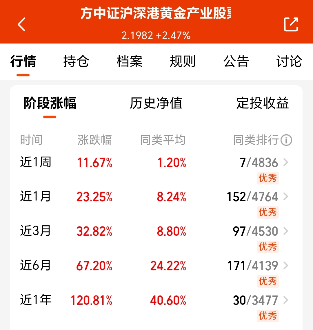 国际现货黄金都冲破5050美元/盎司历史关口了。我上周布局的这个基金又踏准节奏了,周五涨2.47%,今天估值涨近7%,近一个月也拿下23.25%的好成绩,近6个月涨了67.20%,近一年狂赚120.81%,黄金牛又来了,今天我继续定投一笔。