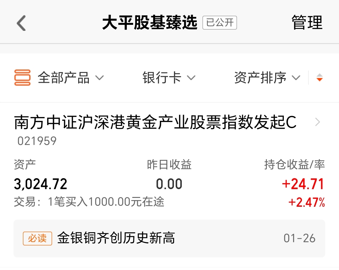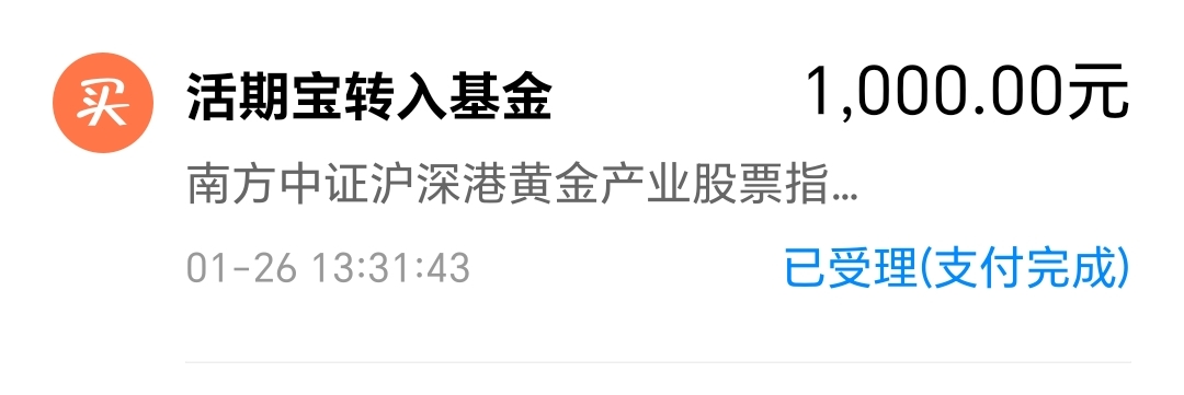 今天我买入$南方中证沪深港黄金产业股票指数发起C(OTCFUND|021959)$1000块钱。