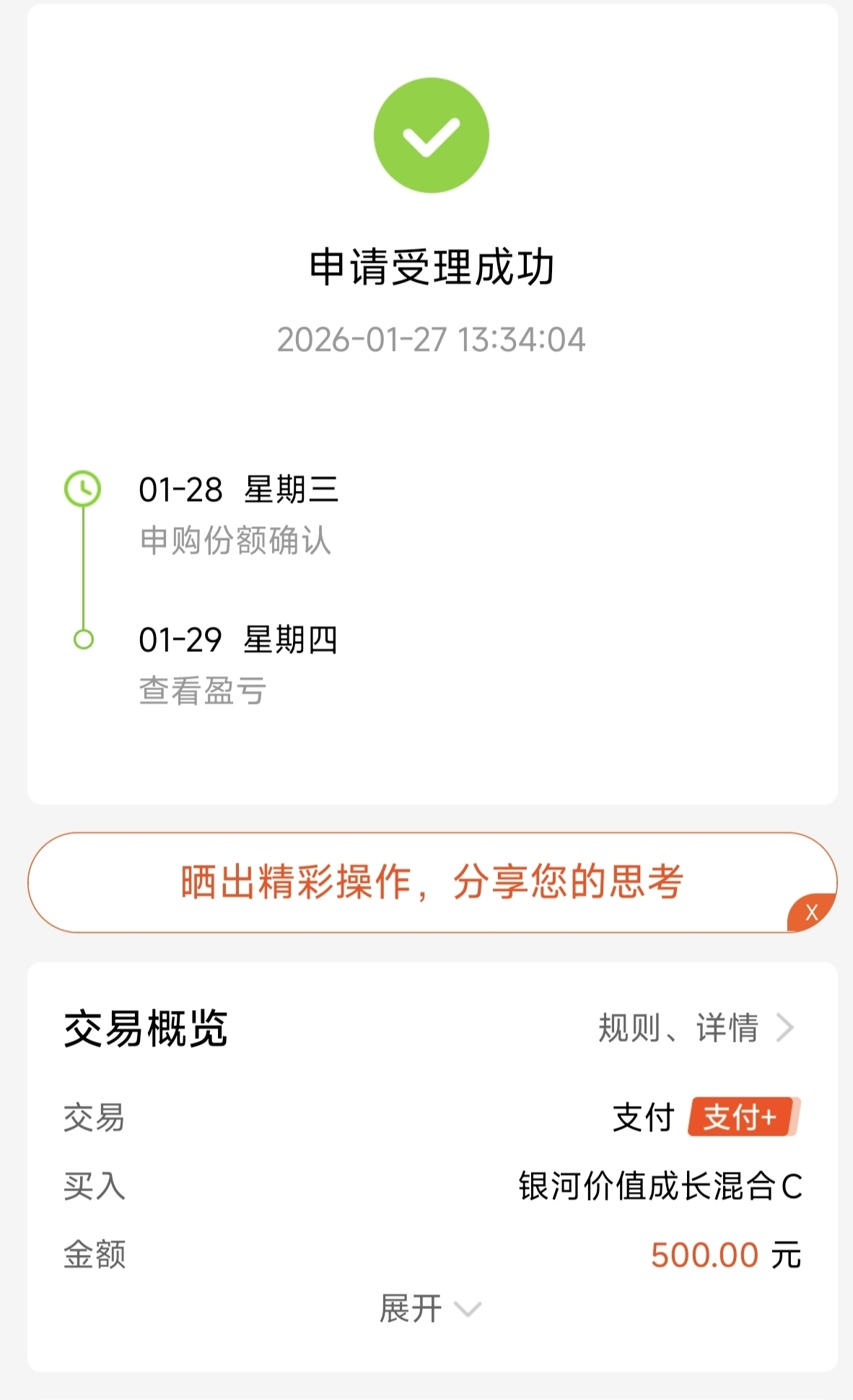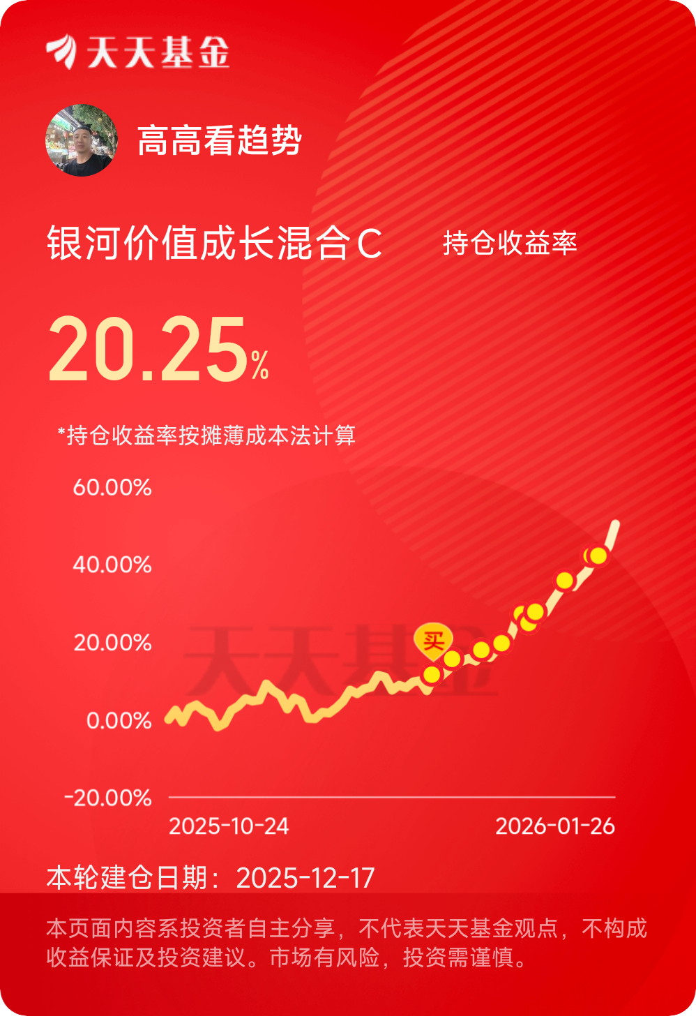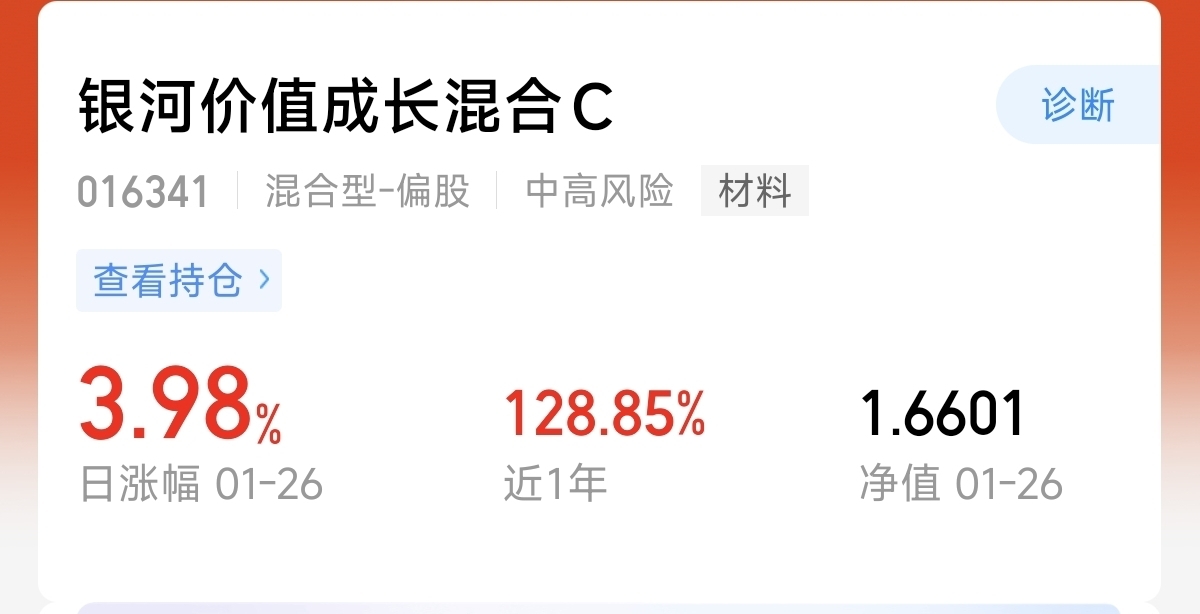 今天我决定继续布局持有的$银河价值成长混合C$ 这只主动混合的基金,目前主要聚焦有色金属跟化工产业,当前中东地缘升温,随着油价的上涨,化工产业也开始迎来上涨周期,基金市场整体均衡,昨天上涨了3.98%,近一年涨幅128.85%,今年来一直在创新高,而且每次遇到波动回撤也是比较稳,我看好基金长期的稳定表现,今天我继续逢低定投500。