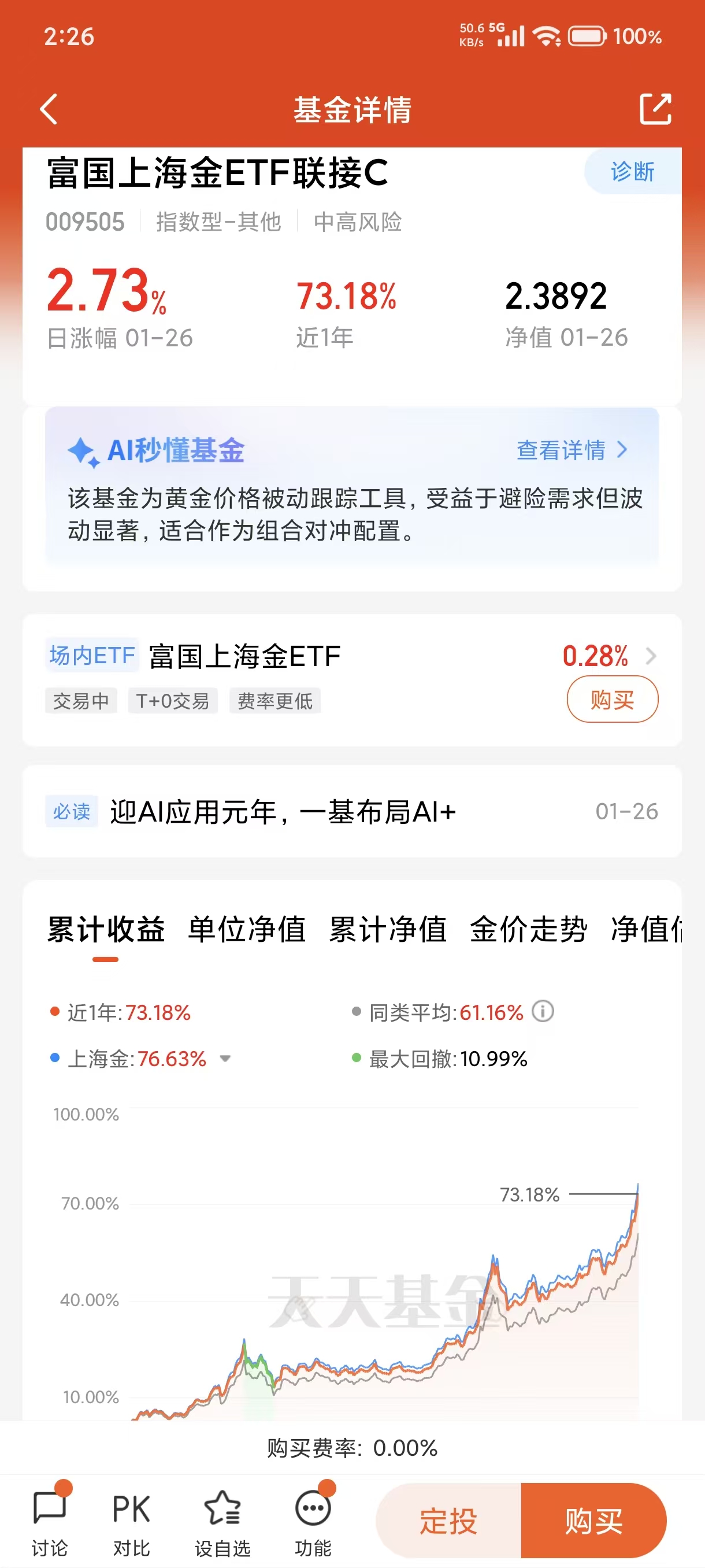 今天我选择加仓1000元富国上海金ETF联接C( 009505 ),这只基金紧密跟踪上海黄金交易所的黄金现货实盘合约(如Au99.99),也是同类跟踪上海金规模最大,同类费率最低的,我后续会持续加厚仓位,长期看好这只基金的表现。$富国上海金ETF联接C(OTCFUND|009505)$