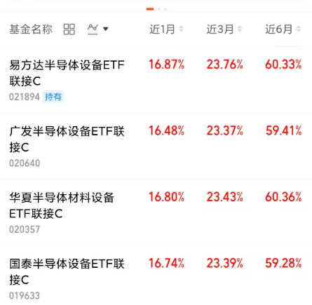 易方达半导体设备ETF联接C(021894),基金跟踪中证半导体材料设备指数,覆盖半导体产业链中技术壁垒最高、国产替代需求最迫切的环节。前十大重仓股包括北方华创、中微公司、沪硅产业、安集科技,覆盖光刻胶、硅片等关键细分领域。$易方达半导体设备ETF联接C(OTCFUND|021894)$
