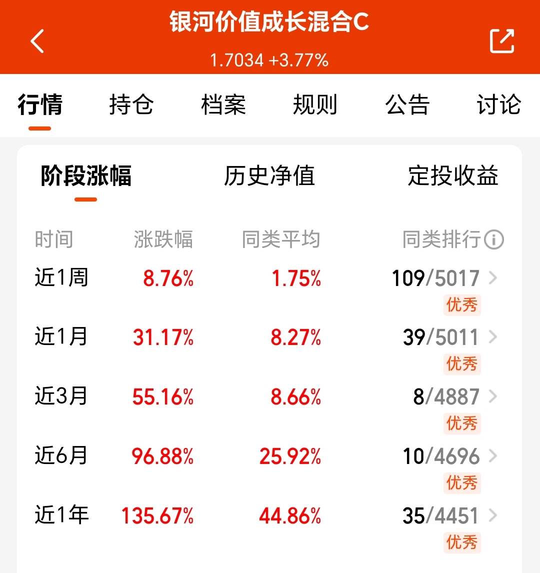 最近一直定投真香!昨日大涨3.77%,短期爆发力不错,近一周涨近9%,近一月超31%,近三月超55%;中长期续航也强:近六月涨近97%,近一年超135%,弹性优秀且业绩持续,远超业绩基准,我目前也盈利18%了。