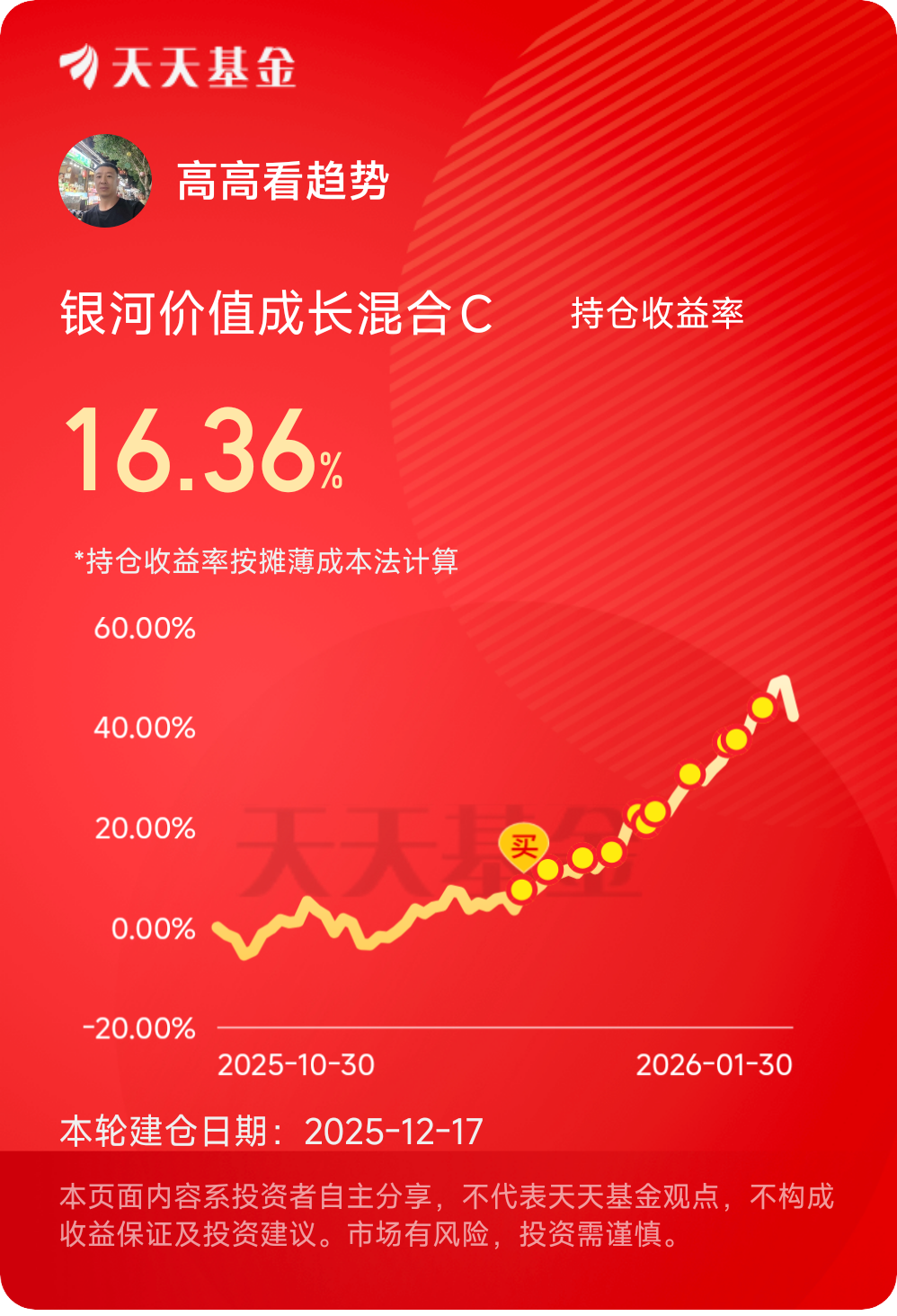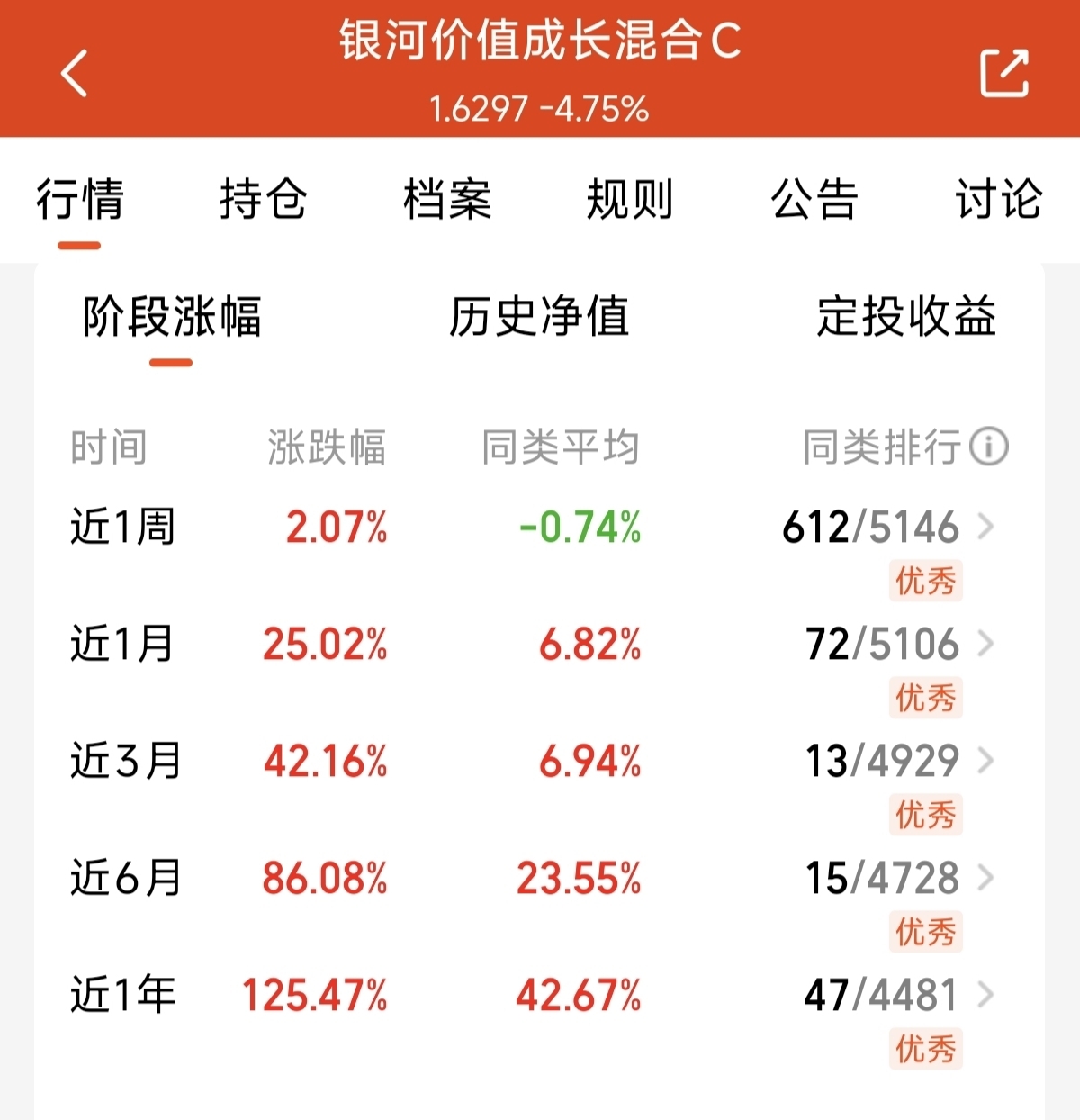今天我决定继续低位定投$银河价值成长混合C$ 这只聚焦有色金属跟周期化工的主动混合基金。在上周有色金属的大幅回调中。回撤控制对比单一的行业基金还是稳定的多。近一年涨幅125.47%。长期的表现做到了涨多跌少。今天难得回调。我低位继续定投500