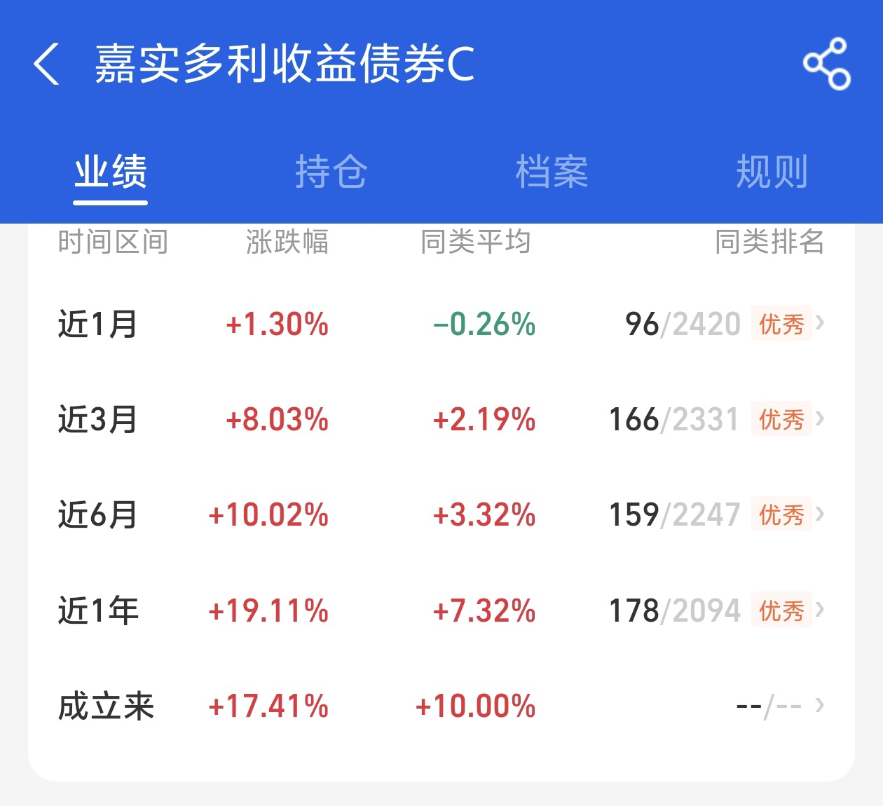 $嘉实多利收益债券C$ 近期表现的也是非常的优秀,近一个月收益130个蛋,近三个月收益803个蛋,近一年的收益率高达19.11%,收益率高!各阶段业绩在同类基金排名领先,长期持有,投资性价比高。基金采取股、债平衡策略,灵活搭配,收益率高。基金回撤小、修复能力快,长期持有,投资回报率高,期待后期收益。