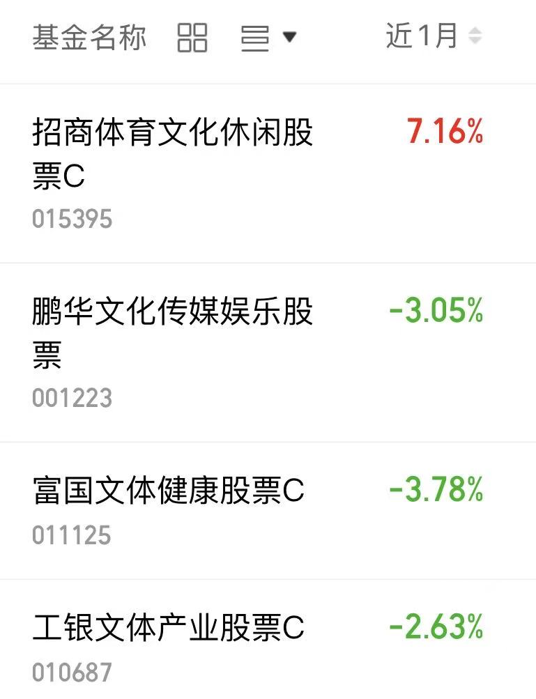 今天A股继续反弹上涨啦,盘面相当的不错呢,上涨的板块也多,今天可以继续弥补收益啦,文化体育娱乐方向近期也有表现不错的,$招商体育文化休闲股票C(OTCFUND|015395)$近一个月涨幅7.16%,还不错呢!