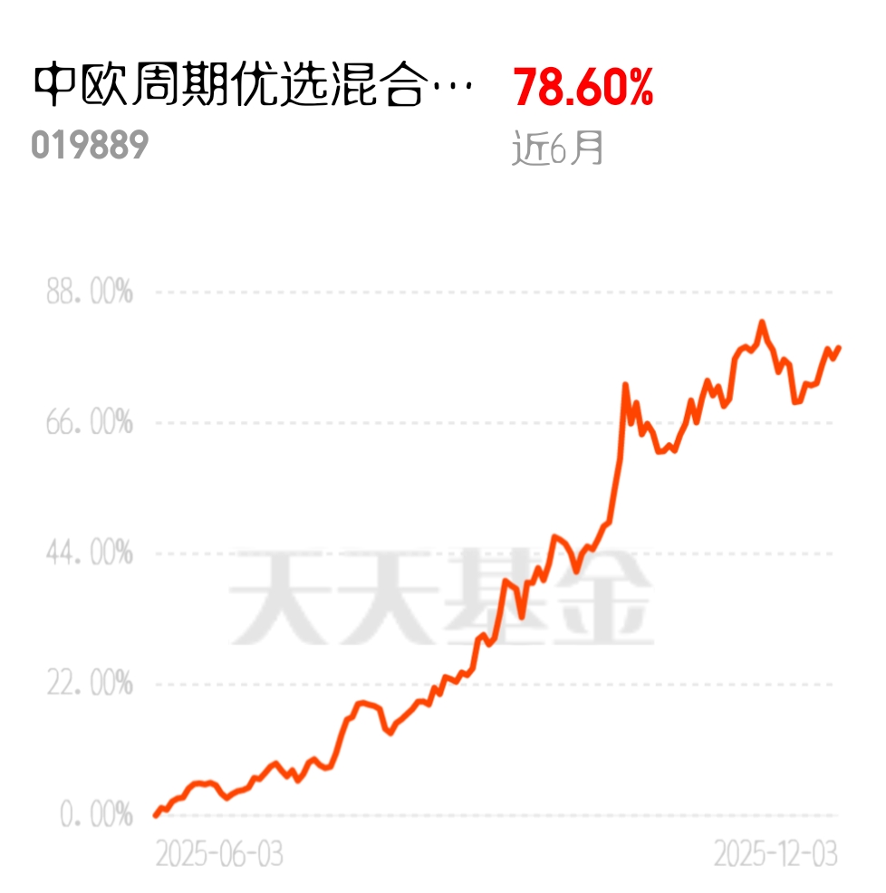 电网升级和 AI 数据中心建设双轮驱动,铜需求持续超预期,矿山产出增长有限,供需紧平衡状态难打破。中欧周期优选混合发起 C 近 6 个月 78.60%,直接受益铜价上涨,赚得盆满钵满。