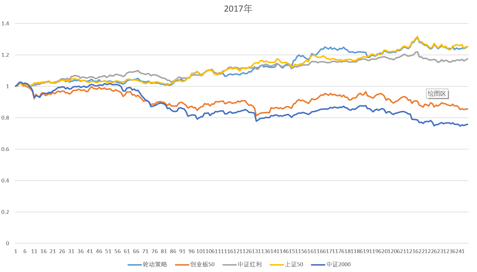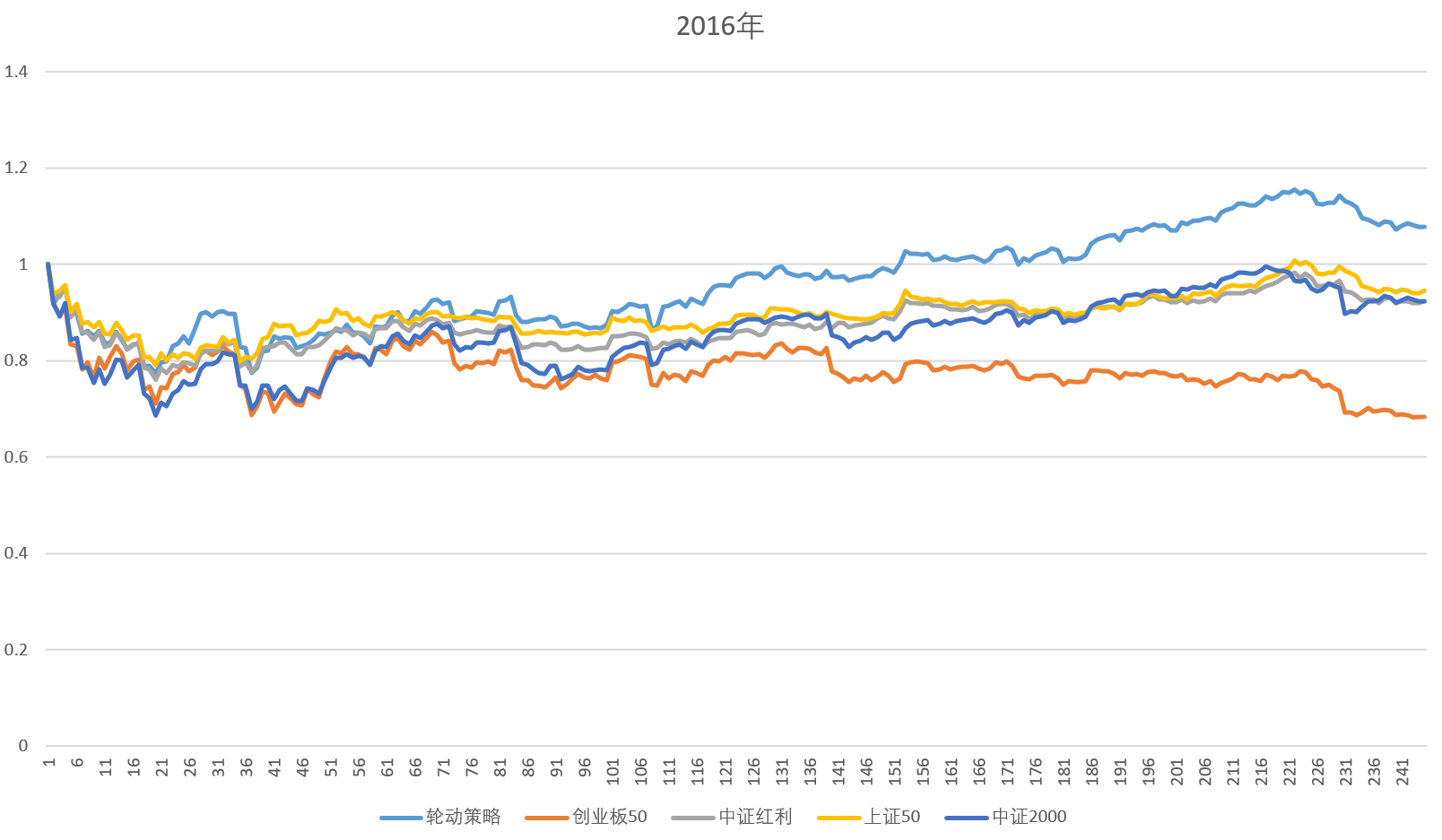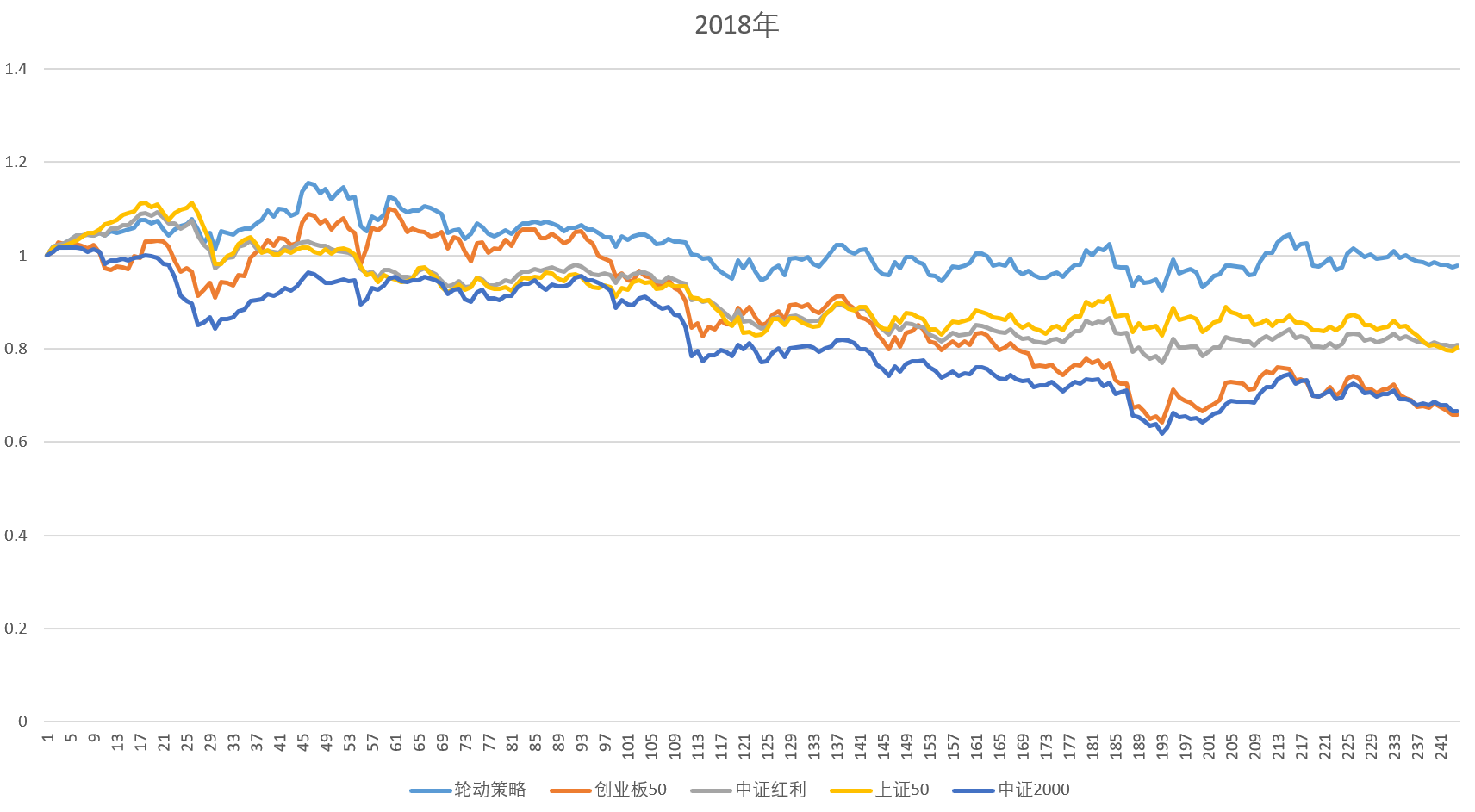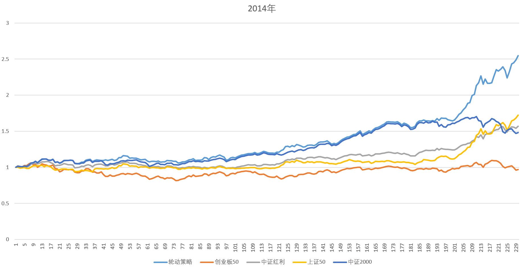 昨天有读者在我帖子中留言说:“难道执行轮动策略每年都能正收益?”其实并不是,我想2019年以来轮动策略之所以年年收益率为正,可能因为和弱势行情出现时总有指数表现强势有关。从我回溯2014年的历史数据来看,还是有些年份表现并不是太好。以下是2014年至2018年各年度轮动策略和其它轮动标的的走势对比图:
