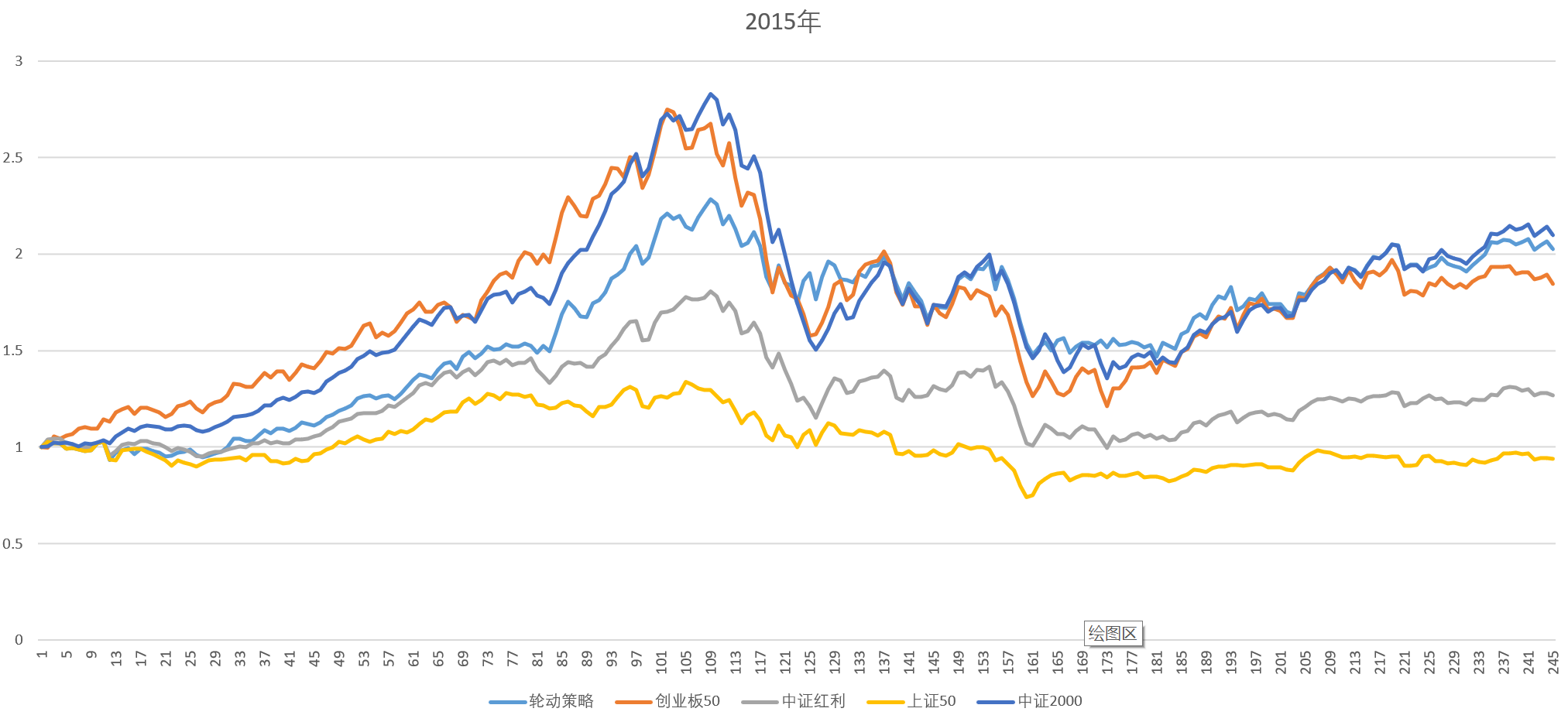 另外需要注意的是2015年轮动策略也曾出现过大幅度回撤现象,我仔细测算了一下当年的最大回撤幅度,发现从2015年6月12日开始执行轮动策略,至2015年9月25日,回撤幅度高达35.59%。