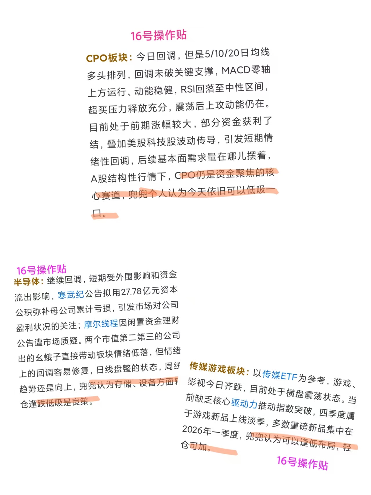 今儿新能源方向终于回暖,CPO直接带飞全场!昨天操作提示里让大家低吸的CPO、存储芯片,随便捡一个都有4%打底收益!还有那些博主都看空的游戏板块,我偏说横盘震荡安全边际高,让大家低吸一口,这不又吃上近3%的肉!工业金属同理,上周二周三提示大家CPO高抛T一波,完美躲过这周回调,现在低吸回来,妥妥的满嘴流油!跟着我节奏走,吃肉根本停不下来!