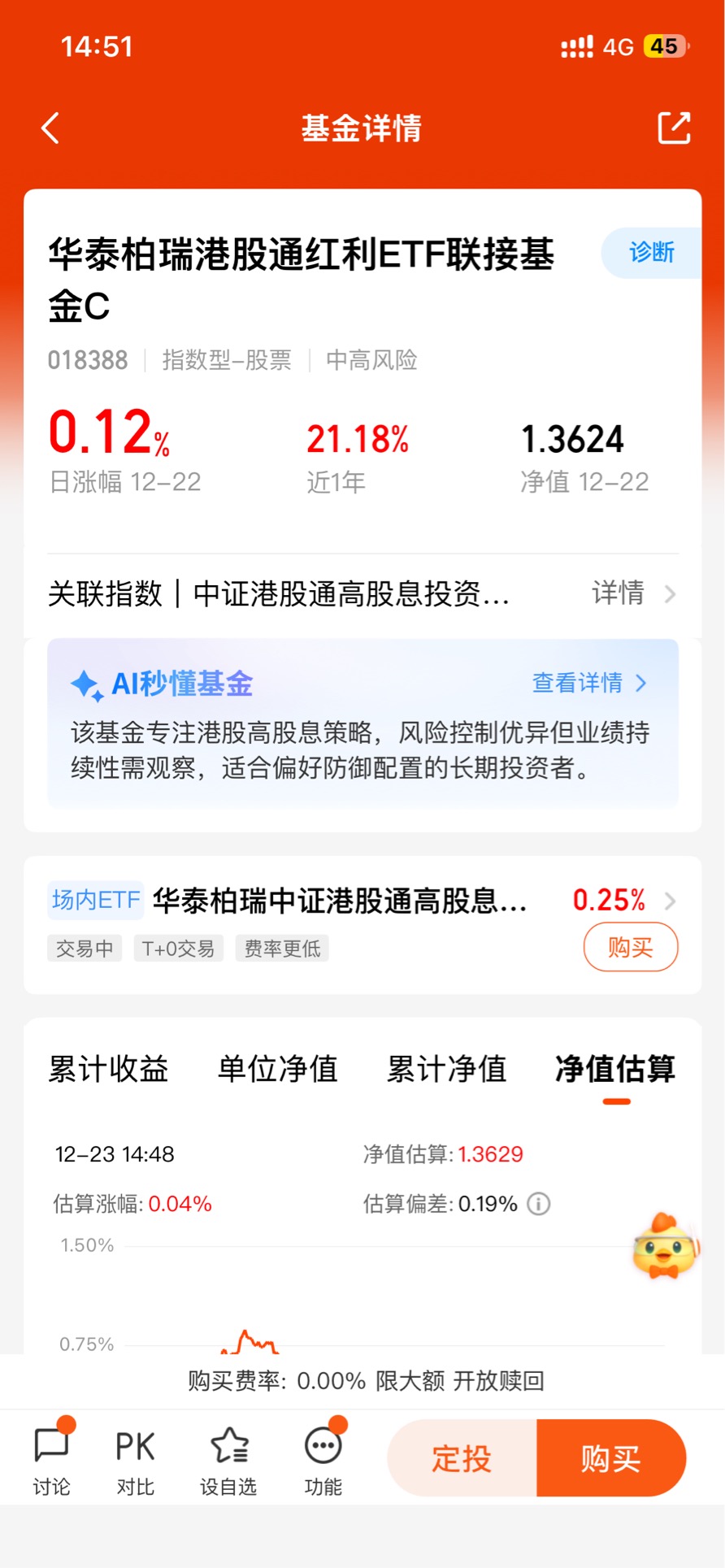 今天红利板块的行情走得很稳,虽然没有那种暴涨的架势,但整体是慢慢往上爬的状态,能看出来市场现在对红利这类偏防御的方向挺认可的。毕竟现在行情里求稳的人多,高股息的标的本身就有抗跌的属性,红利板块这种稳扎稳打的走势,刚好戳中了不少投资者想求稳的心思。趁着这个行情,我留意到了华泰柏瑞的相关产品,它主打港股通红利方向,近一年收益也挺亮眼的,而且购买还不用手续费,对于想布局红利赛道、又想兼顾港股市场的人来说,这款产品挺合适的,毕竟是指数型的,跟着板块走也不用自己费脑选股。$华泰柏瑞港股通红利ETF联接基金C$ #A股年成交额破400万亿!#