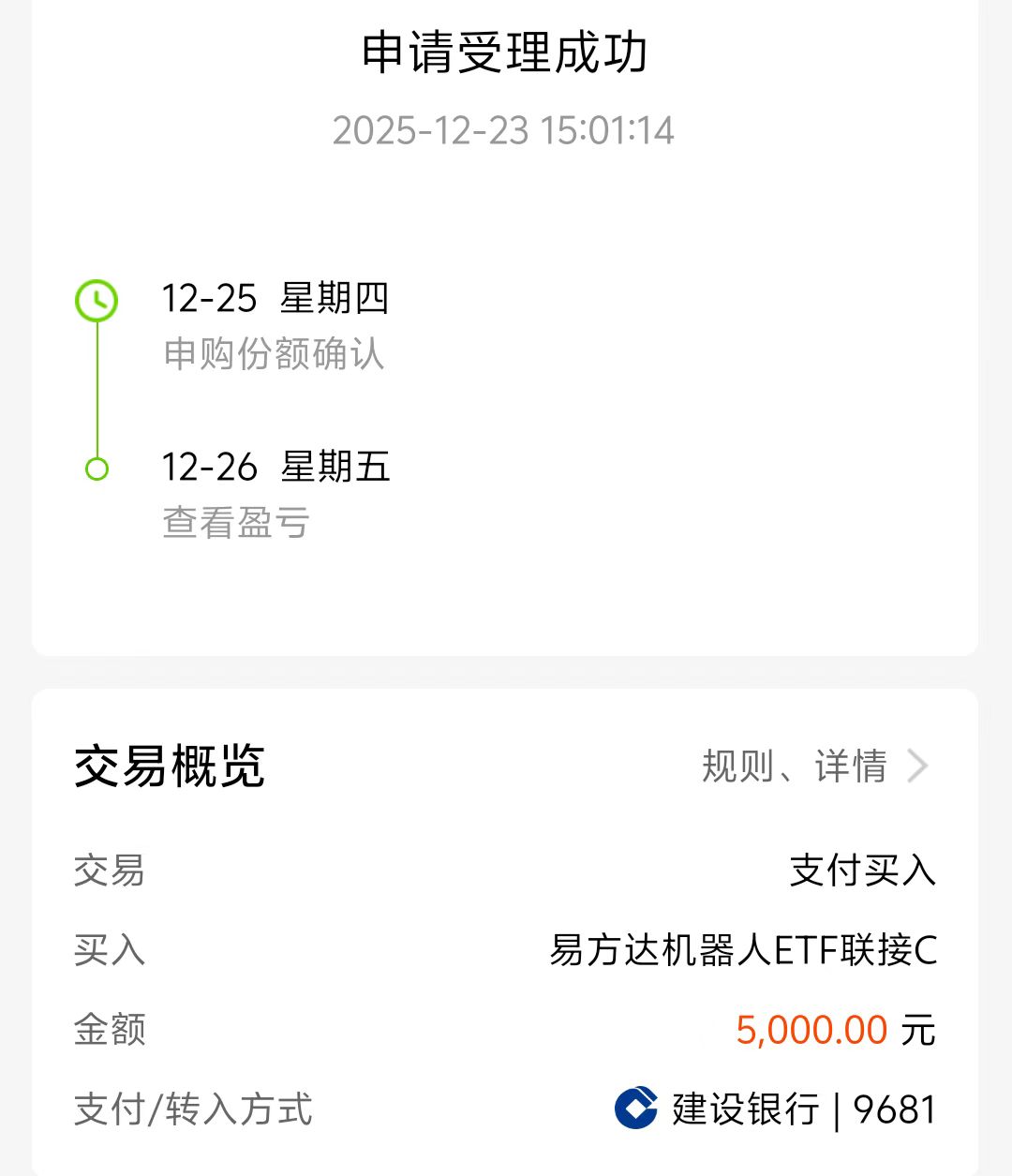 午后我A由红转绿,今日装备、国防军工、人形机器人等多个板块走跌,老铁都知道我关注机器人板块已经很久了,这个板块的弹性足,前景大,是可以长期布局的,我计划趁着今天市场倒车接人上车易方达机器人ETF联接C,这个基持仓中人形机器人的占比高,业绩也优异,所以我打算先占好位,等待来年起飞!