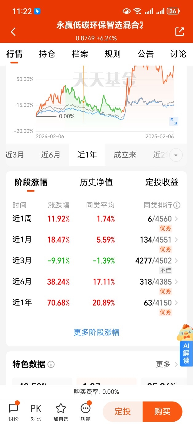 低空经济今天又是红红火火的一天,开启三连涨的节奏啦!$永赢低碳环保智选混合发起C$ 昨天大涨+6.24%,今天大涨+5.35%,目前的估值又挺不错,真心羡慕车上吃肉的小伙伴。$永赢低碳环保智选混合发起C$ 聚焦低空经济方向,是市场上唯一纯粹的低空经济基金,持仓纯粹,弹性也猛,近一年的涨幅高达70个点,行情刚刚来,目前乘胜追击应该不错。#人形机器人板块大涨!能追吗?#