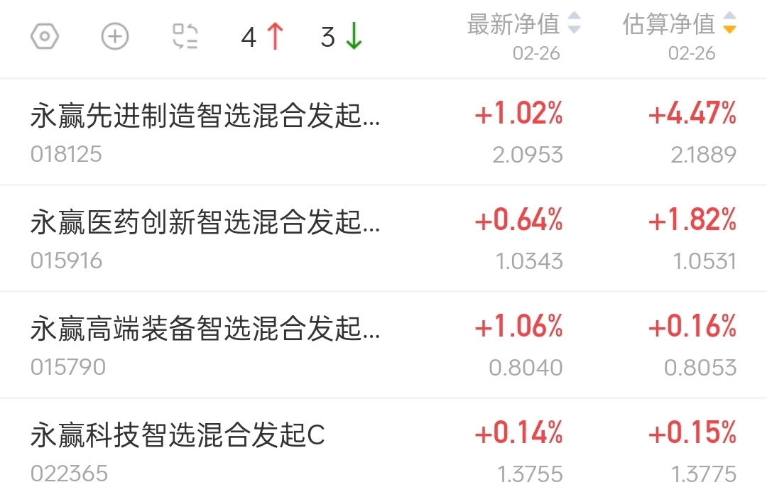 永赢葫芦七兄弟又涨了、永赢全家桶都涨了,太好了!$永赢高端装备智选混合发起C$ 目前最新估算+0.16%!$永赢科技智选混合发起C$ 目前最新估算+0.15%,希望继续拉升多一点!