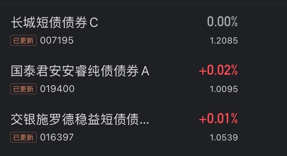 今天债市有点小震荡,有的基金红有的基金绿,还好我手里的国泰债基稳住了阵脚,最近还收了不少蛋,拿着真安心。