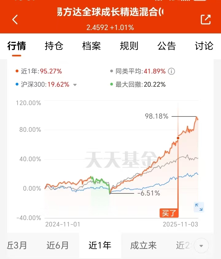 最近科技板块起起伏伏,A股、美股、港股都在波动中往上走。近期科技板块随有所调整,还好我持有的$易方达全球成长精选混合(QDII)人民币C(OTCFUND|012922)$扛住了,回撤做的不错,也是验证了经理灵活调仓的前瞻性呀。它不盯单一市场,能灵活在A股、美股和港股调仓,近一年以来涨了95.27%,回撤比我想象的小,拿着也是比较安心。