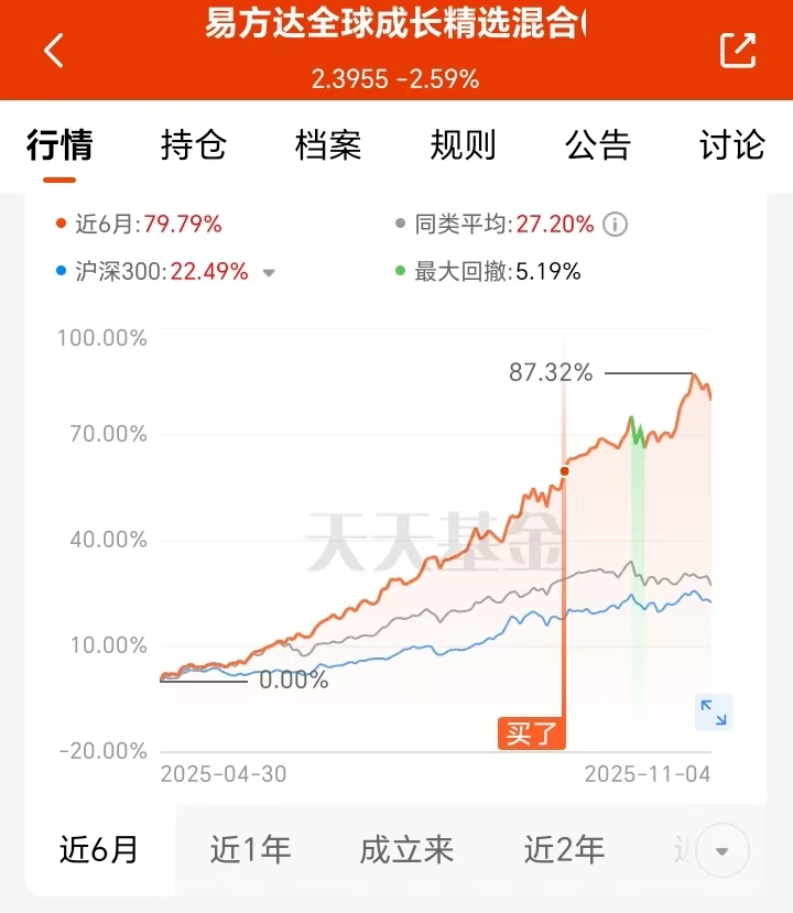 易方达全球成长精选混合C 凭借全球灵活调仓扛住考验,覆盖全球科技龙头,兼顾美股AI算力、港股估值修复与 A 股科技机遇。近半年以来收获79.7%的业绩涨幅,回撤控制超预期,在波动中展现出强韧性。