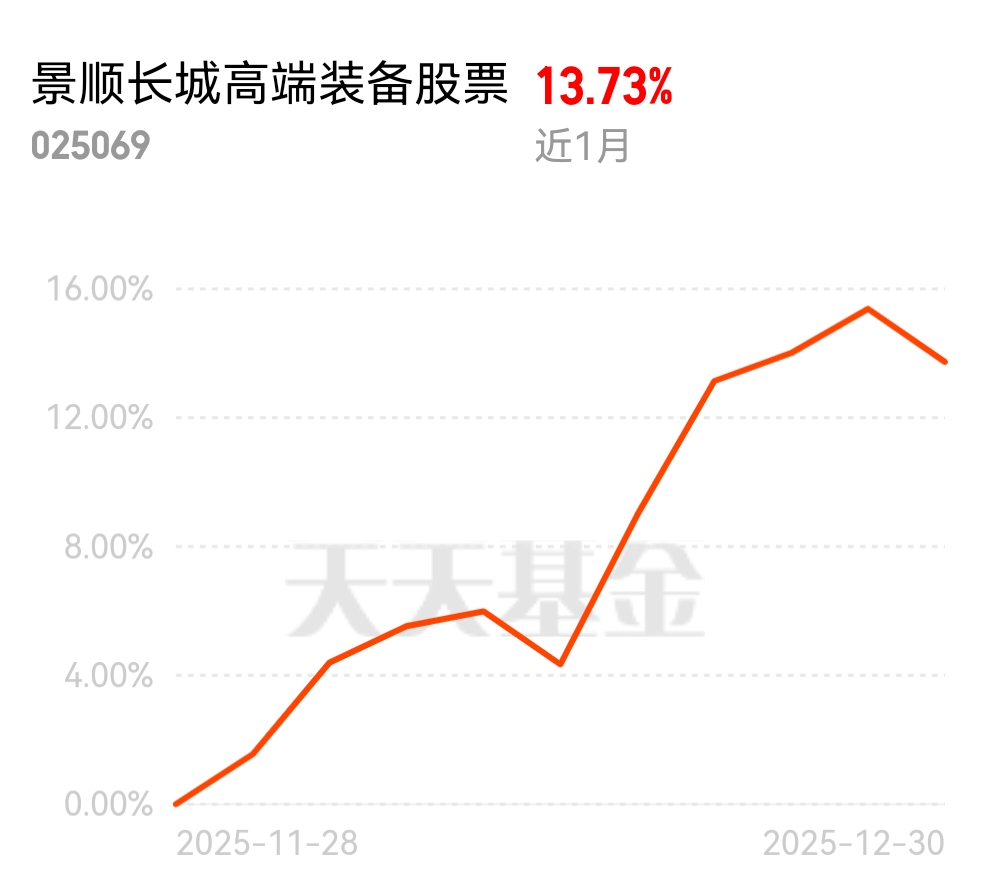 商业航天卫星应用服务合作签约增多,行业落地加速,板块昨天回调今天继续强势,长线趋势不变。景顺长城高端装备股票近 1 月 13.73%,覆盖各类高端制造,成立时间不长但业绩靠前,锐度高,经常能抓住上涨机会。