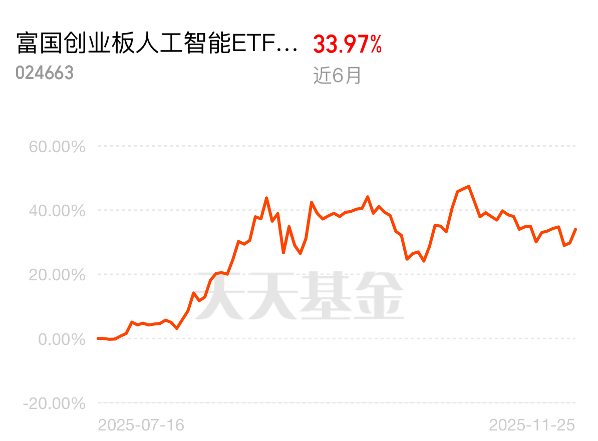 当前手里南方纳斯达克100C有点磨人,但富国创业板人工智能ETF联接C倒是稳住节奏——今天成绩非常亮眼,预估涨幅超5%。AI应用端消息不断,谷歌Gemini 3 Pro多榜领先,阿里千问和蚂蚁灵光用户涨得快;中美风险偏好回暖,A股算力链跟着受益,光模块逻辑不受英伟达波动影响。近6个月涨了34%,超过大多数同类,估值比过去五年41%的时间还便宜。逢跌就是机会,这点没变,今天表现非常亮眼,预估涨幅超5%。