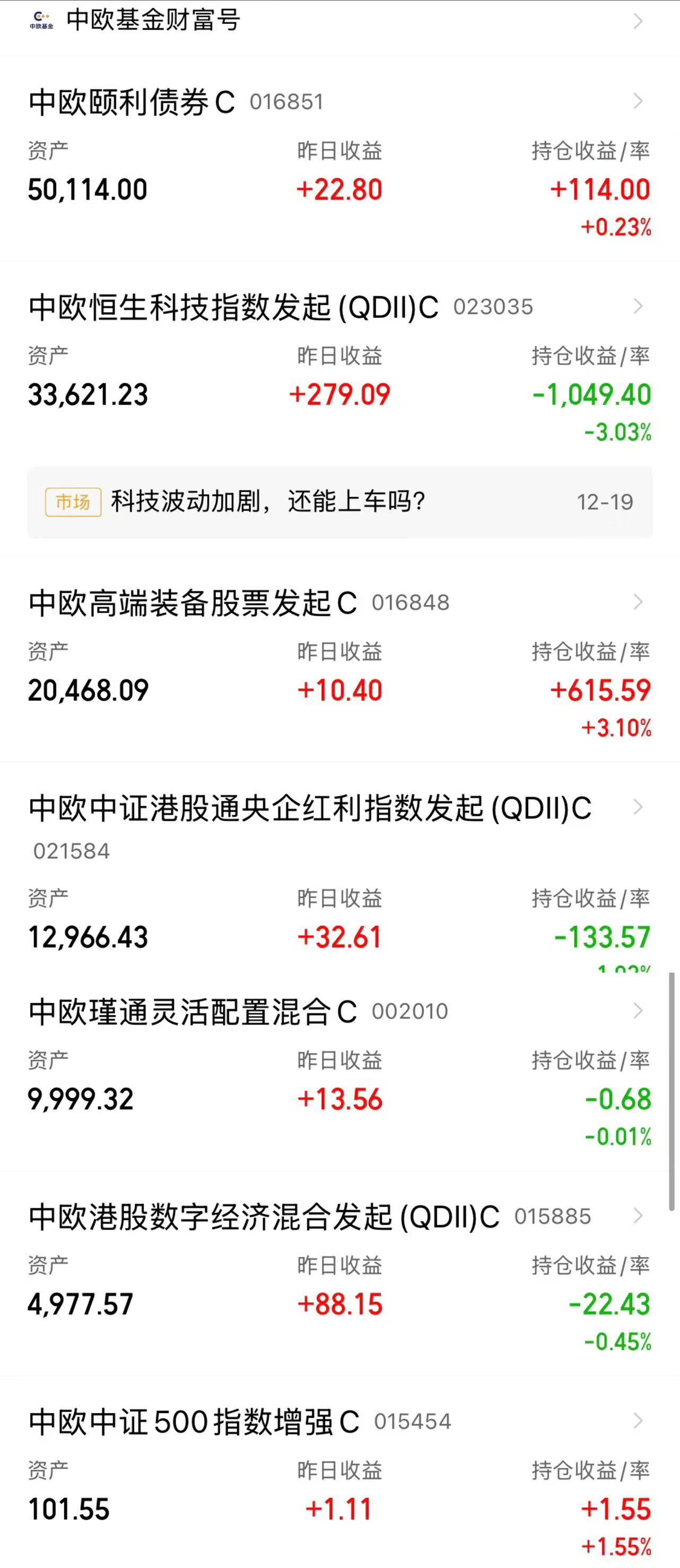 1、我目前持有了中欧基金的债券、混合、指数、股票等7只基金产品,分别是刘勇和胡阗洋经理的中欧颐利债券C(016851),以及中欧恒生科技指数发起(QDII)C(023035)、中欧高端装备股票发起C(016848)、中欧中证港股通央企红利指数发起(QDII)C(021584)、中欧瑾通灵活配置混合C(002010)、中欧港股数字经济混合发起(QDII)C(015885)、中欧中证500指数增强C(015454),基金总持仓金额超过了13万元!